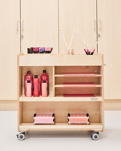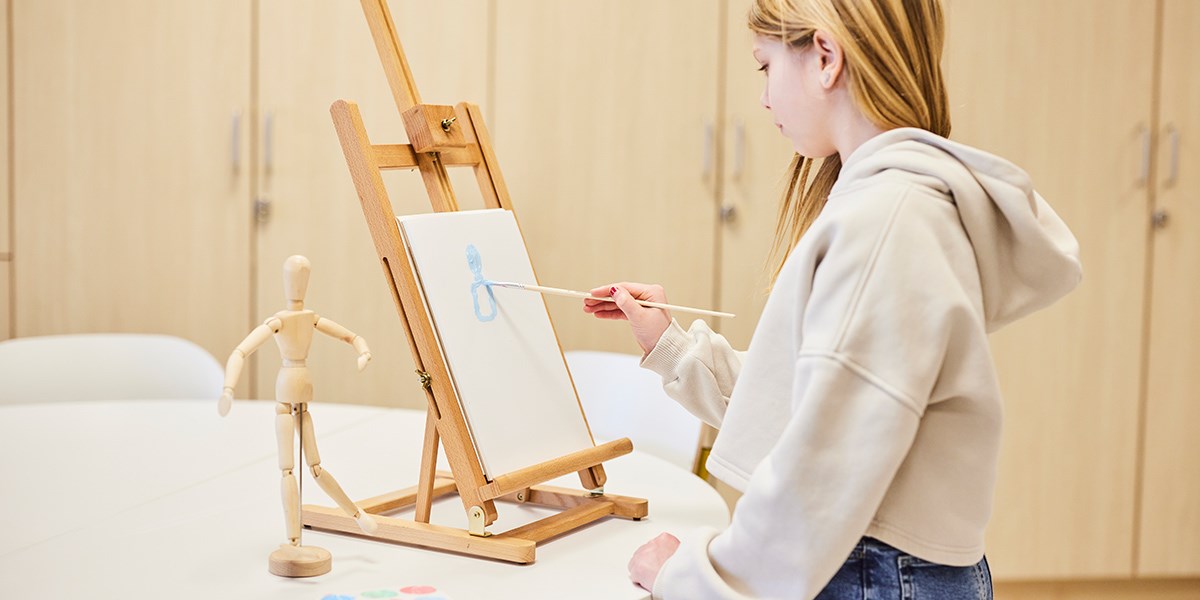 Vem vill inte sätta sig ner och skapa här? Bildsalen har en harmonisk bas där vitt, grått och trä är återkommande inslag. Accentfärgerna rosa, grön och gul på bord 12:38 och stol Matte skapar en levande och kreativ känsla. Här finns plats för skapande i alla dess former som underlättas med den lilla materialvagnen! Här syns även skaparmaterial som bordsstaffli, hobbypenslar, pastellfärger, palett och fiberpennor.