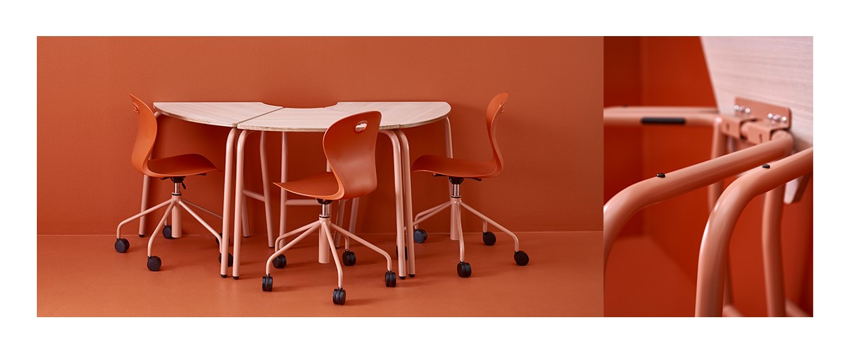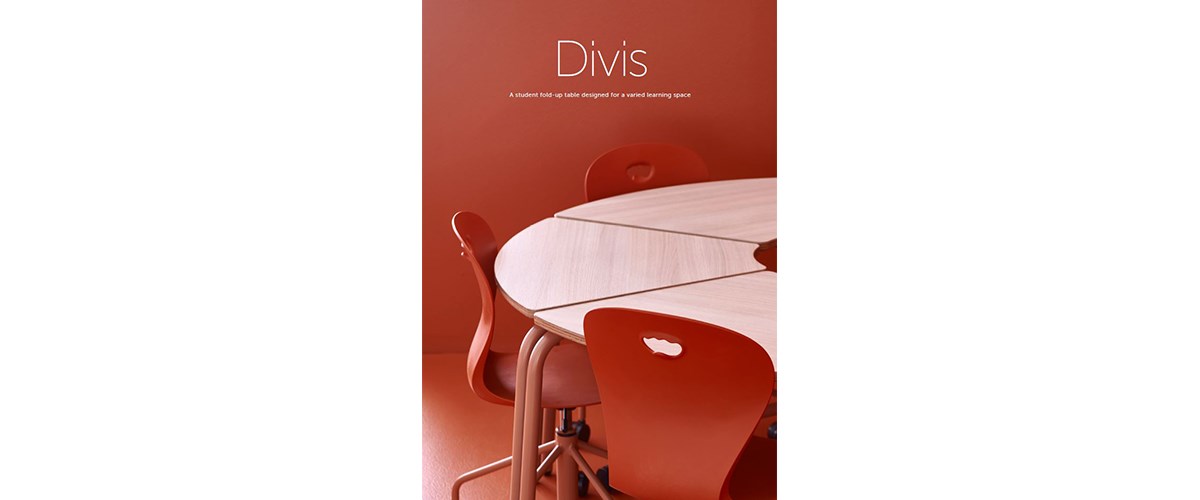 Divis är ett flexibelt elevbord som enkelt anpassas till olika lärsituationer och miljöer. Bordsskivan är triangulär i 60° och med sex bord skapas en cirkel där det i mitten finns plats för en Powerhub. Bordet har hjul fram för enkel förflyttning och tvärstag som även fungerar som fotstöd. Om borden ska ställas undan kan skivan fällas uppåt för att spara plats. Bordsskivan är i kompaktlaminat och stativet i metall. Ett smidigt elevbord som möjliggör flera olika lärsituationer i ett och samma rum på skolan.