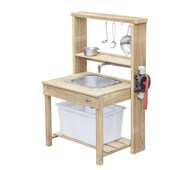 Ett roligt kök med egen vattenpump. Barnen utvecklar sin kommunikationsförmåga i verklig köksmiljö. Vatten fascinerar barn och denna produkt ger stora möjligheter till utomhuslärande. Pumpmekanism som är lätt att använda, plastbalja och kökstillbehör ingår. Tillverkad av träskyddsbehandlad furu. Levereras omonterat. Mått: L50xB69xH102 cm. PVC-fri. Från 3 år. Ämnad för utomhusbruk.