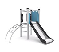 Ett högt aktivitetstorn med tre rutschar. I övrigt finns det klätternät, klättervägg, klätterrep, koordinationspaneler, stegar och brandmannastång. Se produktblad för materialspecifikation och övrig info. Vid installation ska alltid den medföljande manualen användas. Den senaste versionen finns att tillgå på begäran.