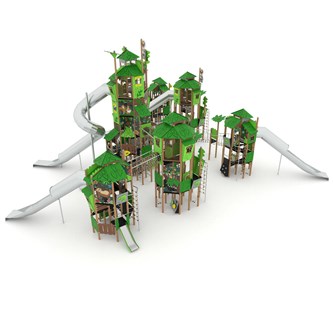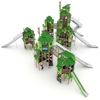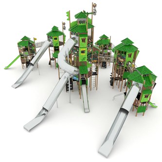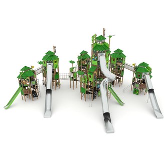 Sex höga aktivitetstorn med sju rutschar. I övrigt finns det klätternät, klättervägg, klätterrep, koordinationspaneler, stegar broar, brandmannastång och en liten gungrem. Se produktblad för materialspecifikation och övrig info. Vid installation ska alltid den medföljande manualen användas. Den senaste versionen finns att tillgå på begäran.