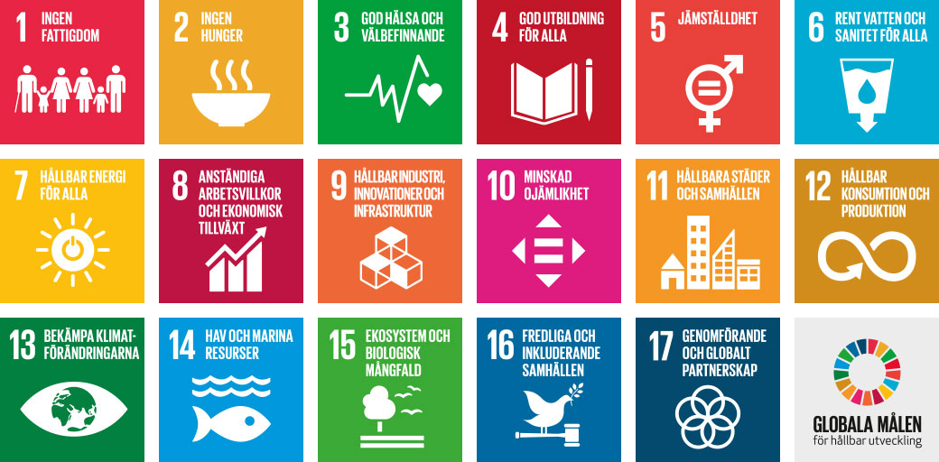 När vi tog fram våra hållbara verksamhetsmål utgick vi bland annat från de utmaningar, risker och möjligheter som FN:s globala mål (för hållbar utveckling) innebär. För planeten, samhället och för oss som bolag. Målet är att nå dessa mål till år 2030.