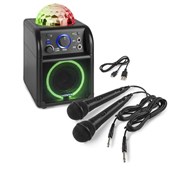 Karaokemaskin med inbyggt batteri, ljuseffekter och en mikrofon. Musik strömmas via Bluetooth. Kan även användas som en bärbar Bluetoothhögtalare. Subwoofer och ekoeffekt. 2 mikrofoningångar 6,35 mm uttag. Mått: 190x160x265 mm. Vikt 1,65 kg. Uteffekt: Max 50 W. Frekvens 30 Hz-20 000 Hz.