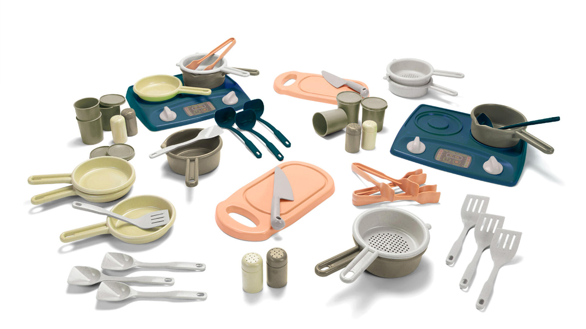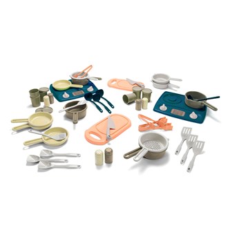 Ett köksset för alla barn som gillar att laga mat. Setet är tillverkat av bioplast baserad på sockerrör. 100 % återvinningsbar. Tål frost. Livsmedelsgodkänd. PVC-fri. Kan diskas i diskmaskin. Från 2 år. Svanenmärkt, licensnummer 50950001.
