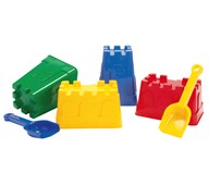 Stora sandformar att bygga borgar med. 4 sandformar och 2 spadar. Mått: 15x15x19 cm. Tål frost. Av PE. Svanenmärkt, licensnummer 50950001.PVC-fri. Från 2 år.