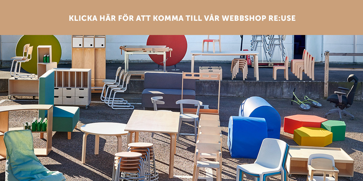 Sedan 2023 kan du som kund handla möbler som till stor del annars hade kasserats via vår webbshop RE:USE. Här finns möbler för förskolan, skolan, fritidsverksamheten och annan typ av offentlig miljö. Webbshopen uppdateras hela tiden med nya förskolemöbler och skolmöbler som kan levereras snabbt då de finns på lager. Produkterna du köper kommer tillbaka till oss efter att exempelvis ha varit utlånade, blivit transportskadade eller efter felbeställningar. Detta projekt är en naturlig konsekvens av vårt viktiga cirkulära hållbarhetsperspektiv och något vi är stolta över att kunna erbjuda.