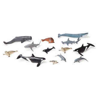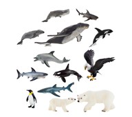 13 st/fp. Havets djur i enklare utförande. Fascinerande och detaljrika djur som lever i havet. Innehåller knölval, gråval, späckhuggare, vithaj, kaskelot, isbjörn, pingvin, valhaj, vithaj, tjurhaj, delfin, kungsörn och kejsarpingvin med unge. Längd 22–30 cm. Mått 6,5-16 cm. Av TPR, PVC, fri från ftalater. Från 3 år.