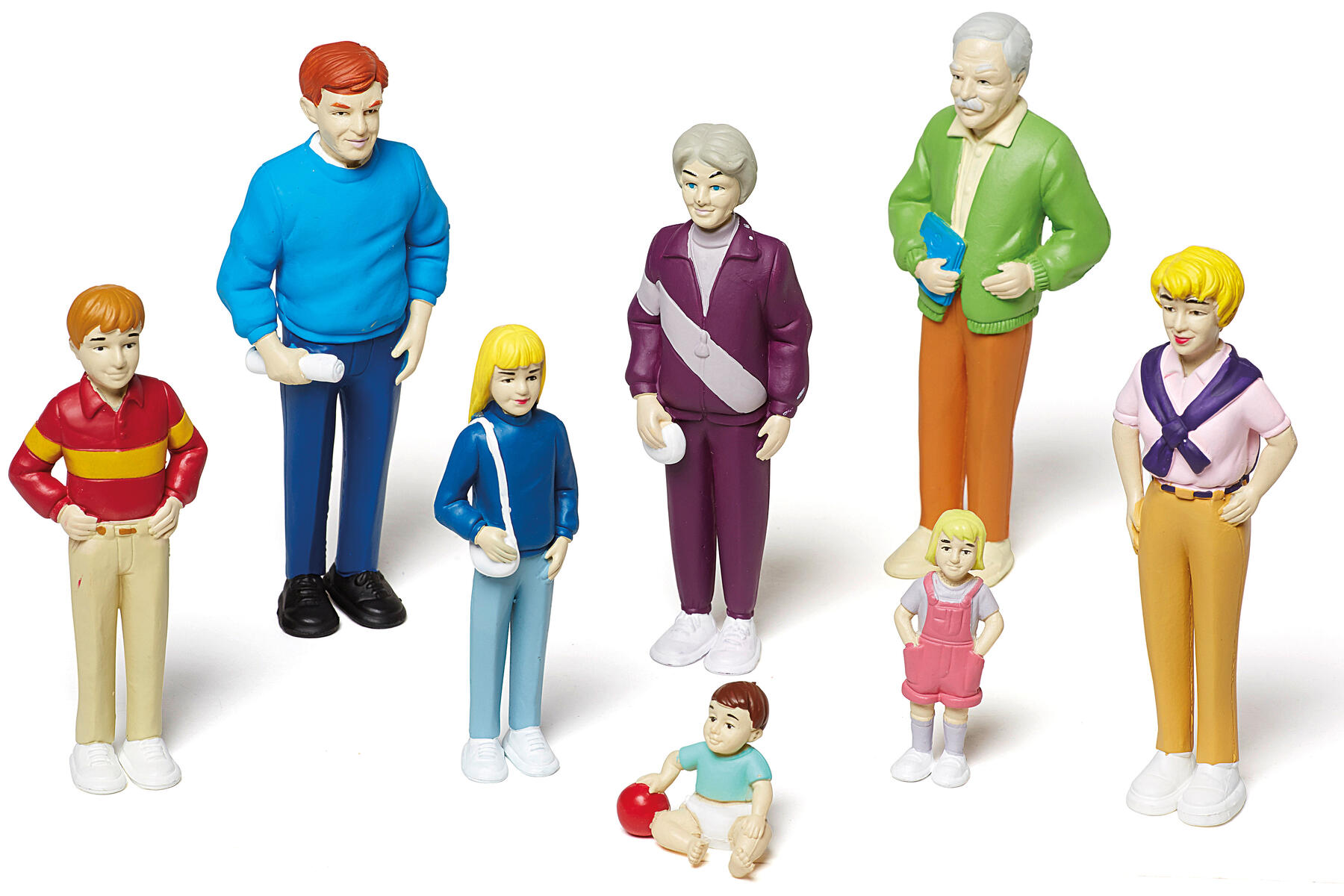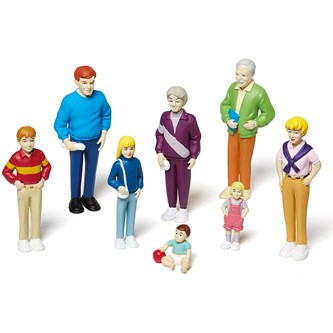 Ett set med lekfigurer i olika åldrar och med olika utseende. Utvecklar barnens förståelse och respekt för olika roller, kön och mångfald. Av PVC, utan förbjudna ftalater. Från 3 år.