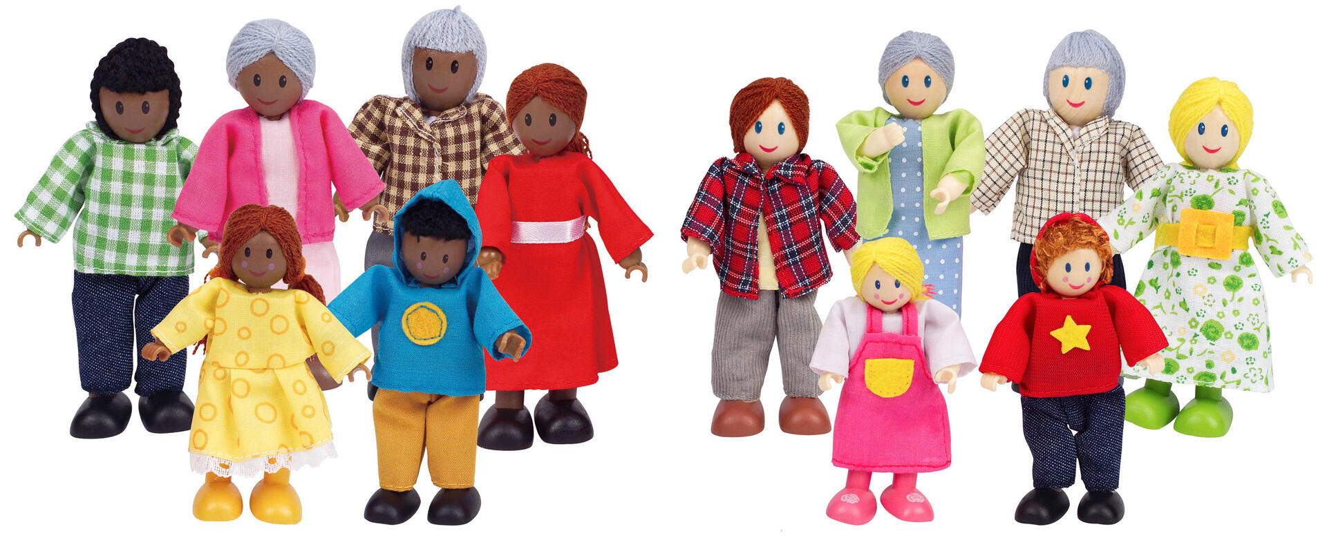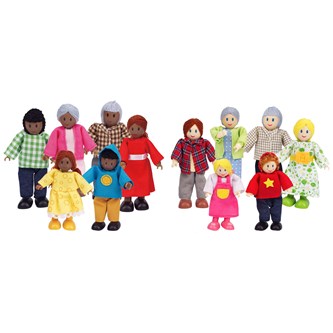 Ett set med lekfigurer i olika åldrar och med olika utseende. Utvecklar barnens förståelse och respekt för olika roller, kön och mångfald. Av PVC, utan förbjudna ftalater. Från 3 år.