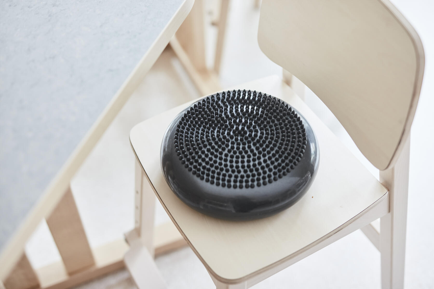 Luftfylld ergonomisk balanskudde som underlättar ergonomi och rastlösa ben i klassrummet. Eleverna kan därmed röra sig utan att tappa koncentrationen för en ökad studiero. Sittkuddens knottriga sida ökar blodcirkulation och känselstimulering. Kuddens andra sida med små kulor passar perfekt att sitta eller stå på. Placera kudden på en stol eller lägg den direkt på golvet för balansövningar, massage och muskelträning. Maxvikt: 100 kg. Mått: 25 cm. Material: Ftalat-fri PVC. Från 3 år.