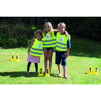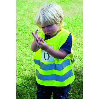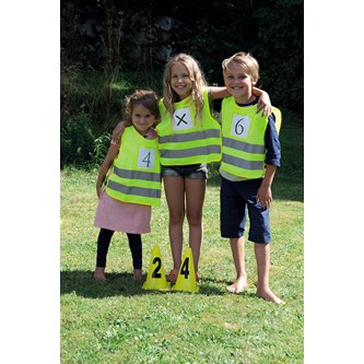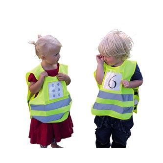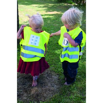 En barn- och juniorväst med reflekterande solgul färg och reflexband. Med transparenta plastfickor, en fram och en bak, där man kan sticka in sifferkort, bokstäver, färger, geometriska figurer m.m. Mått på plastficka: 12x12 cm. Lagom mellan 5-10 år. Säkerhetsprodukt vars funktion försämras när den blir smutsig. Ej avsedd för lek.
