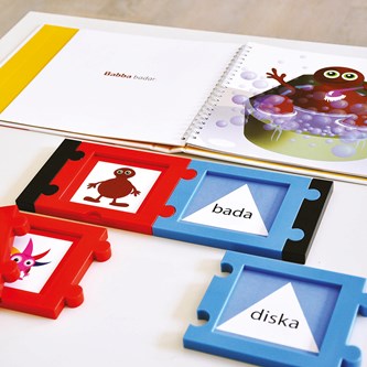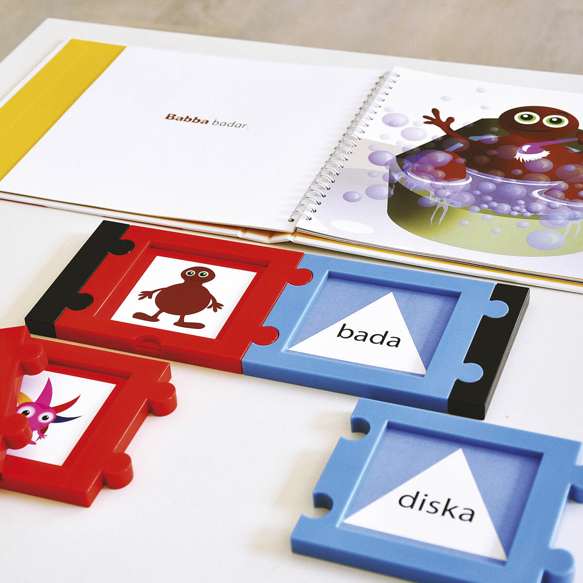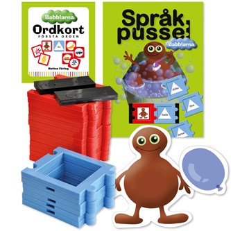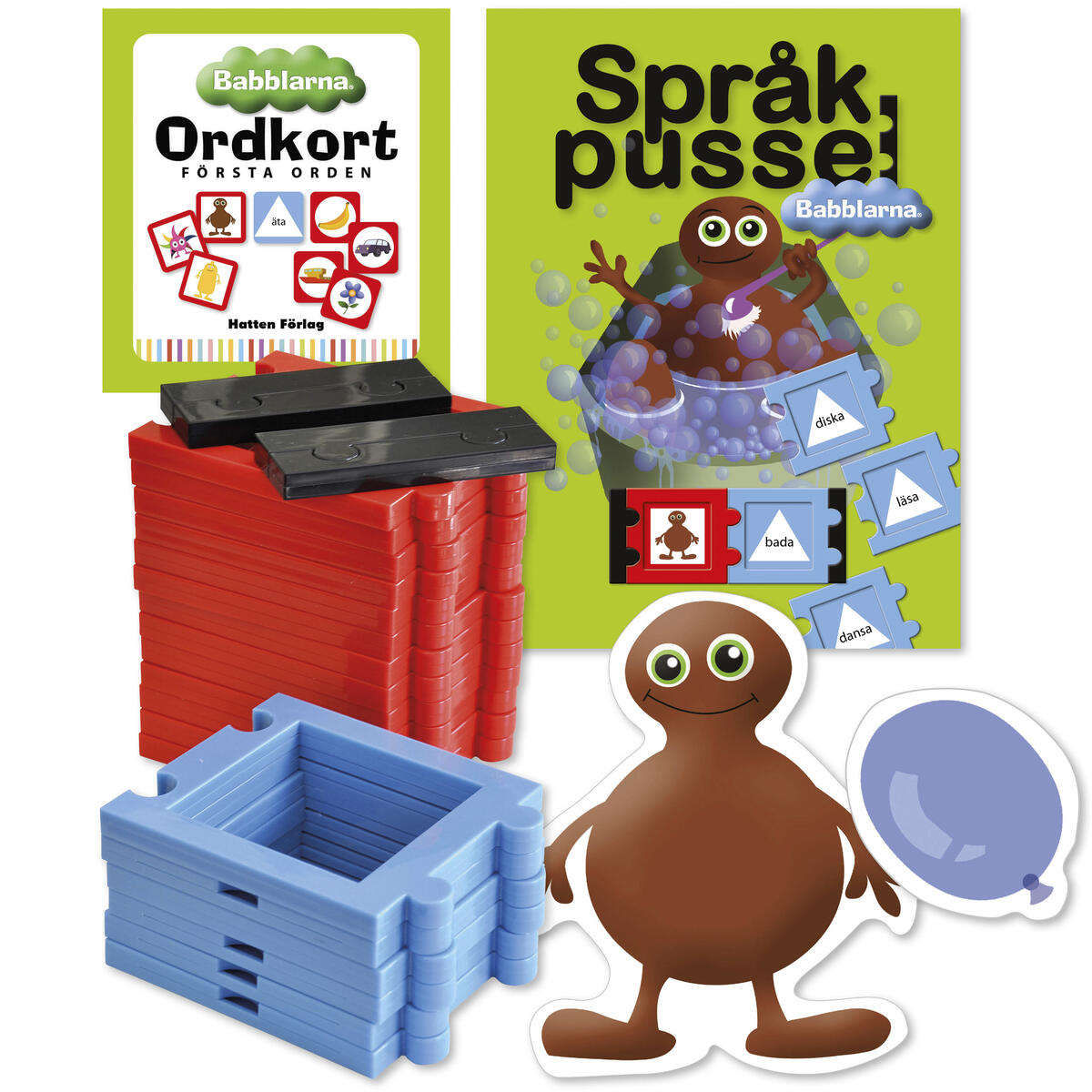Utveckla språket genom att språkpussla med Babblarna! Babblarna väcker nyfikenhet och lust att lära och ger en utmärkt start till ett språk i utveckling. När ni babblar och leker tränar ni aktivt språkljud och språkmelodi, begrepp och grammatik. Genom att komplettera Babblarnas böcker med tillhörande ordkort i pusselbitar tar ni första steget in i läs- och skrivprocessen. Det svenska språkets grammatik görs tydlig i ett språkpusslande som följer en utmärkt pedagogisk linje. Det går bra att börja språkpussla mycket tidigt i barnets språkutveckling! Man börjar att skriva med bilder och går senare över till text. Innehåller SpråkPusselbitar (13 röda, 6 blå och 2 start/stopp), ordkort (60 st) och satsplattor samt klippark med figurer och föremål som matchar innehållet i de fyra böckerna om Babblarna: Dadda hälsar på, i Babblarnas hus, i Bobbos väska och Var är Babbas saker. Instruktion medföljer.