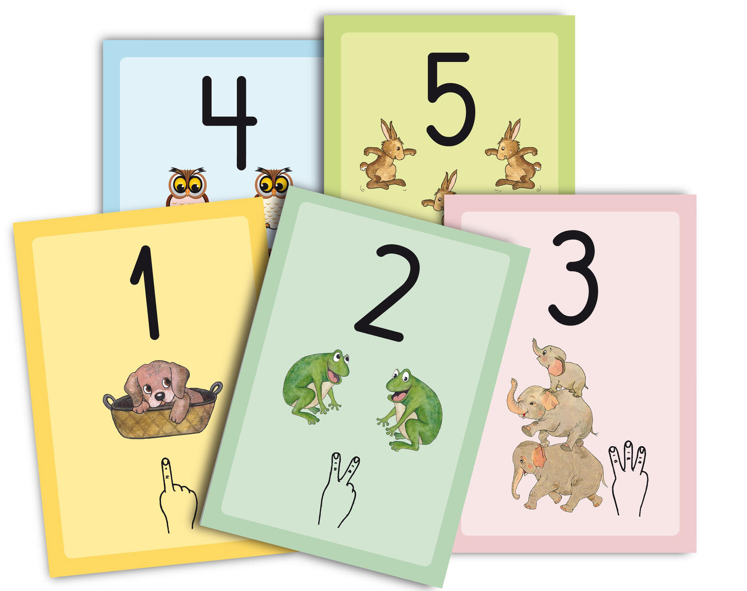 Siffror 0-10 tryckta på kraftig papp. Kan t.ex. plastas eller lamineras in för att göras extra tåligt. Mått: 16x21 cm/kort. Av FSC-märkt papper. PVC-fri.