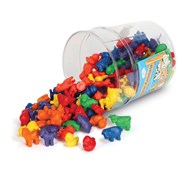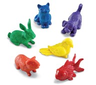 72 bondgårdsdjur i 6 färger för matematikövningar i sortering och klassificering. Mått: ca 4 cm. Av TPR-plast. PVC-fri. Levereras i praktisk burk med lock, av petplast. Från 3 år.