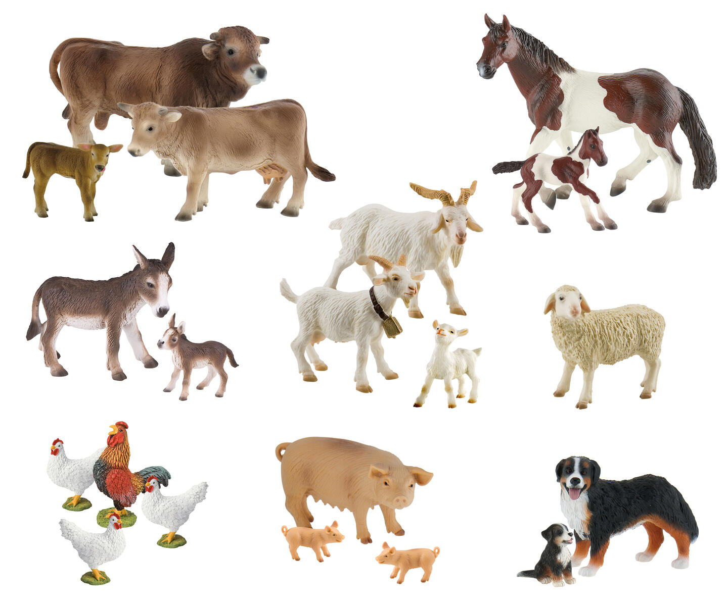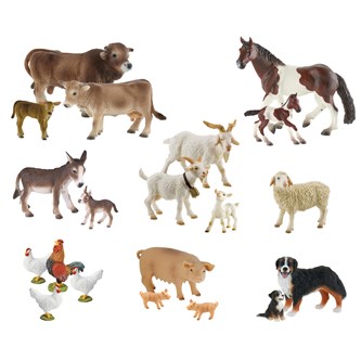 Ett stort set med bondgårdsdjur som är handmålade och av mycket fin kvalitet. Innehållet kan variera, men antalet figurer är samma. Ett av de minsta djuren, en kanin, mäter 4,5x2,5 cm, ett av de största, en hingst, mäter 16,3x10,9cm. Av ftalatfri PVC. Från 3 år.
