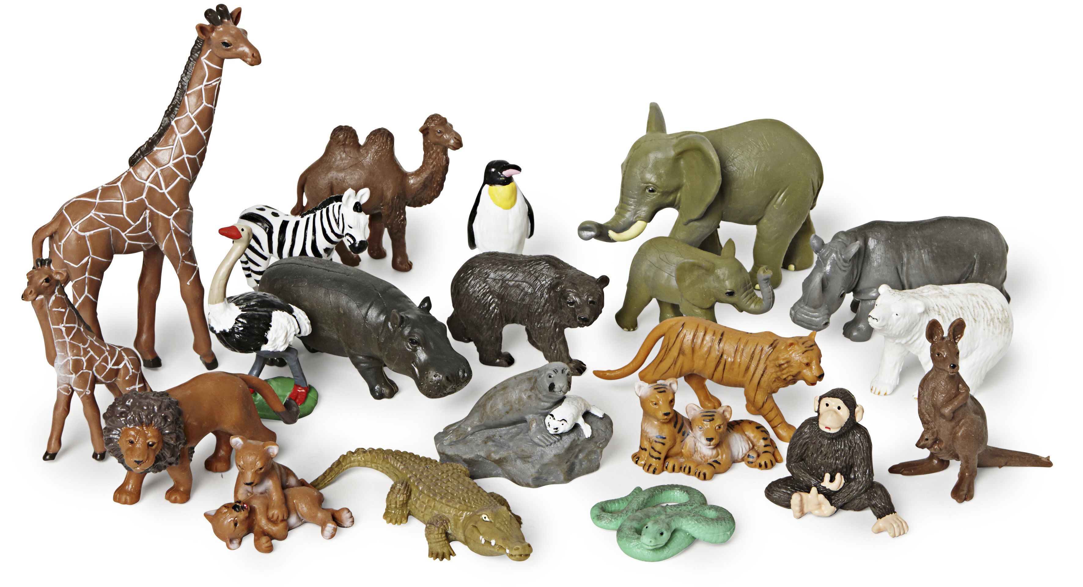 Fina och detaljrika djur från olika delar av världen. Innehåller: tiger, elefant, zebra, giraff, lejonhona, lejonhane, vit tiger och känguru med varsin baby. Av ftalatfri PVC. Från 3 år.