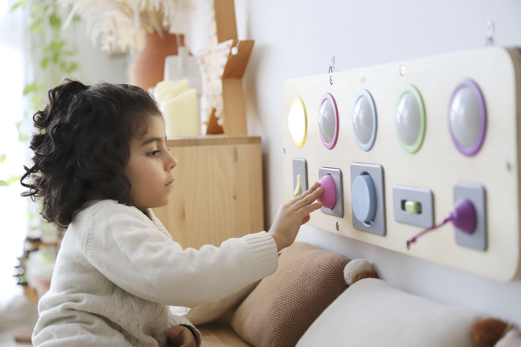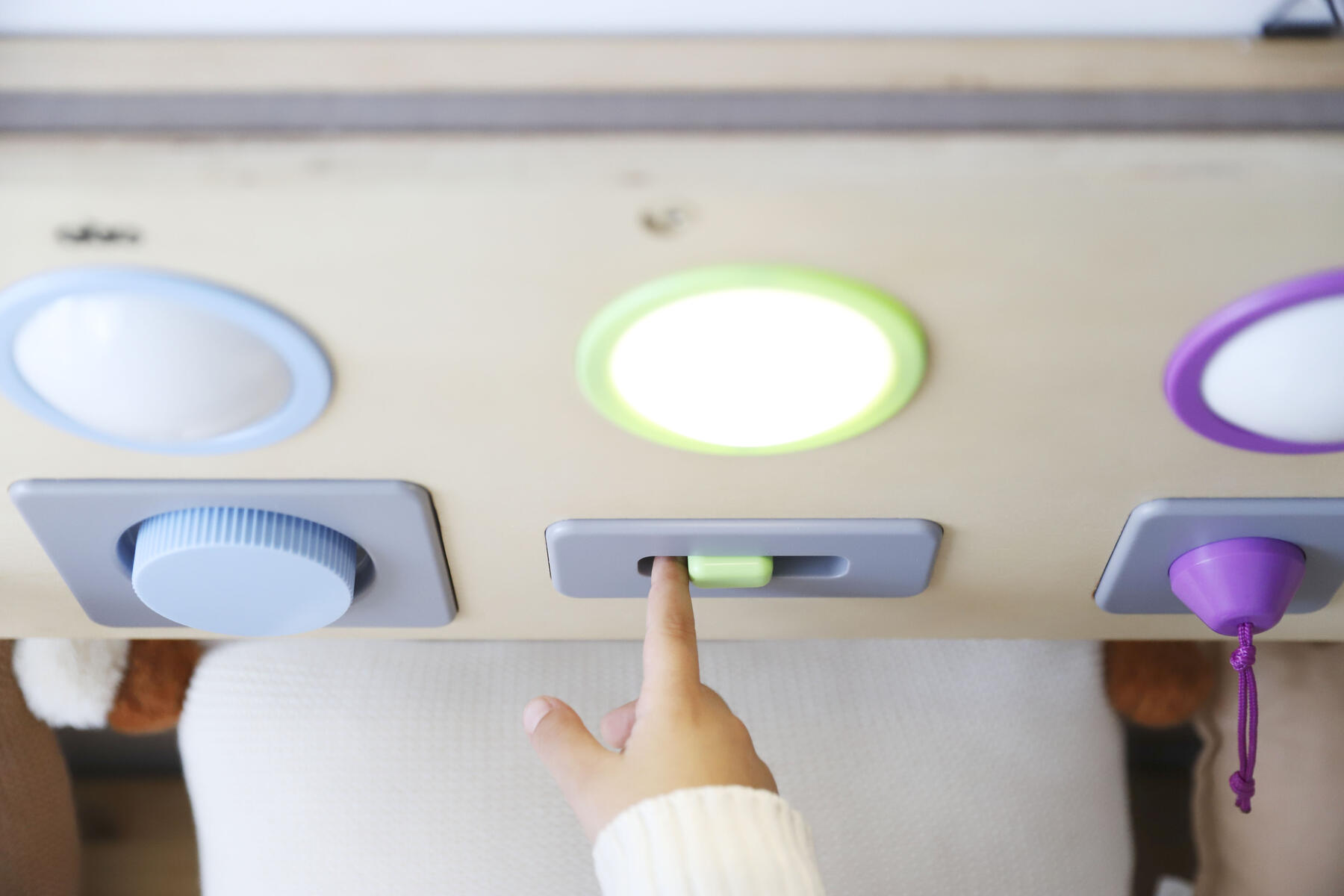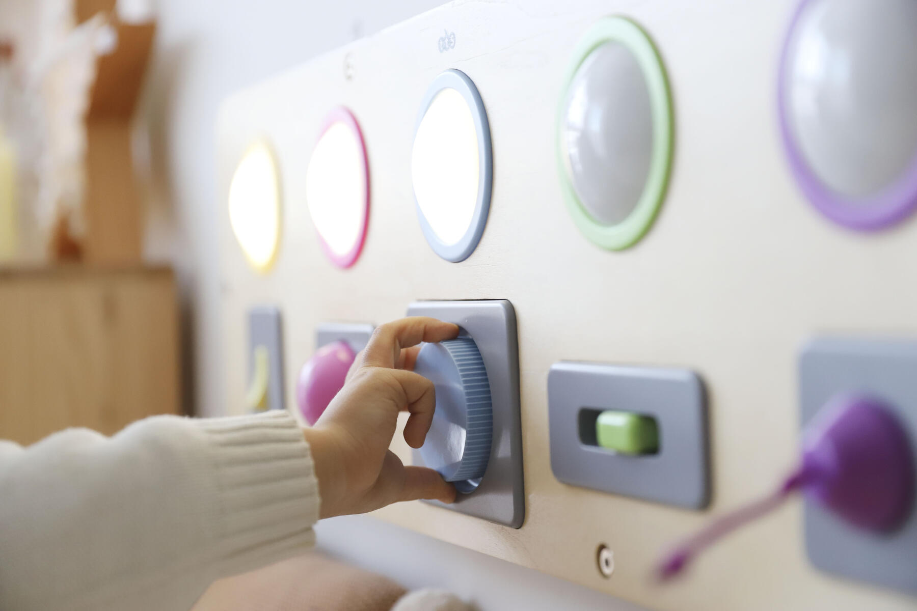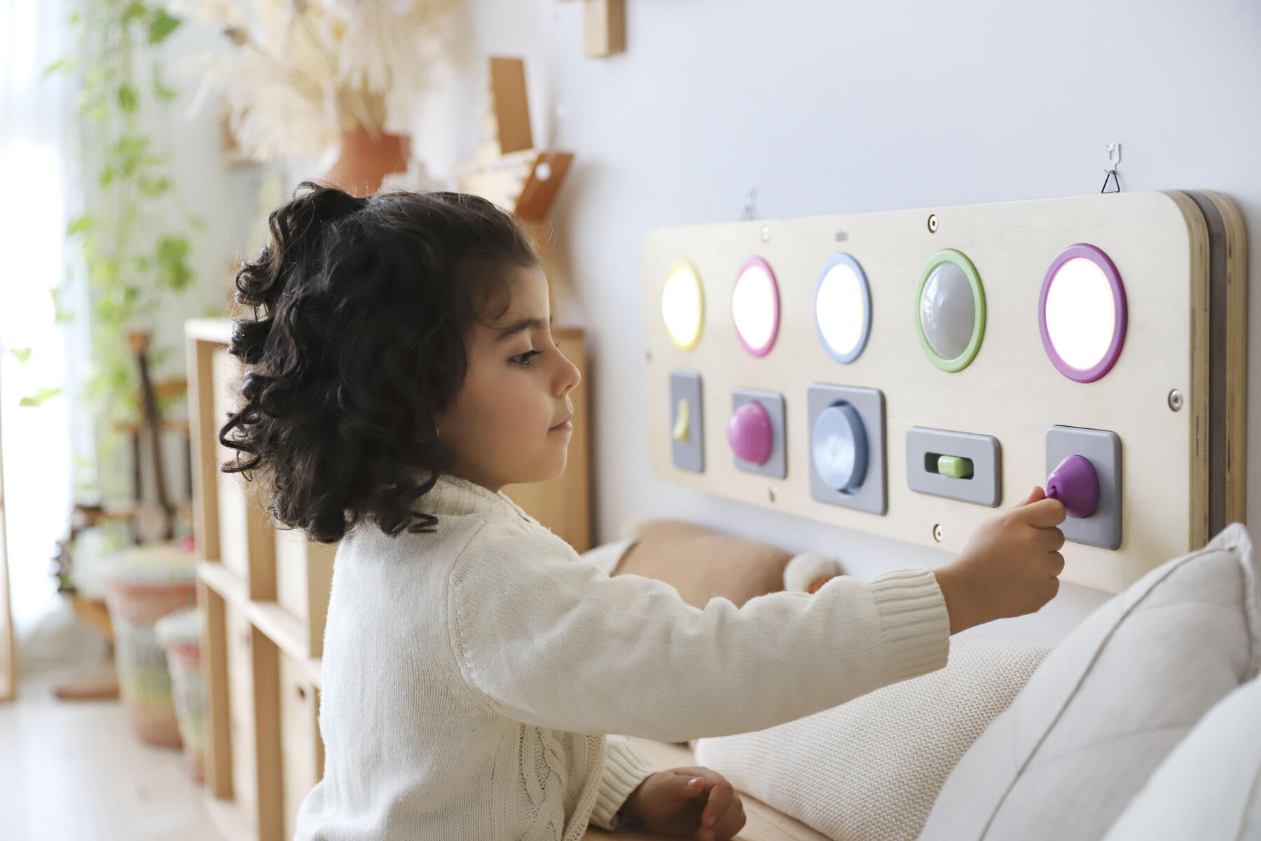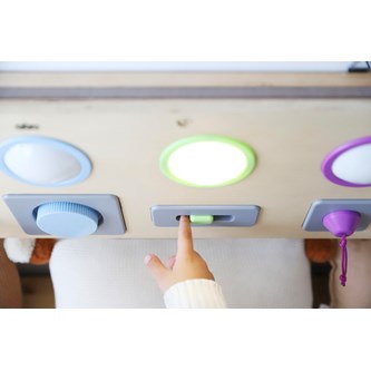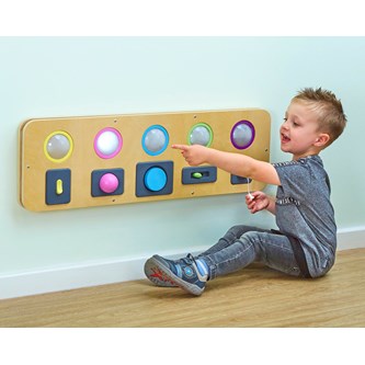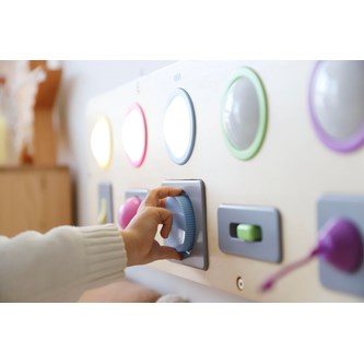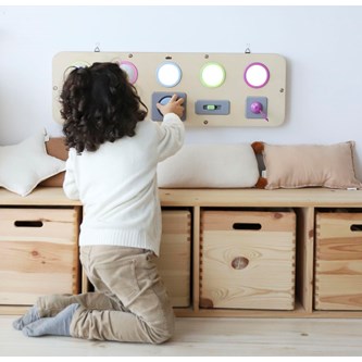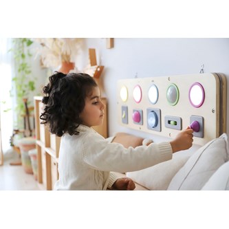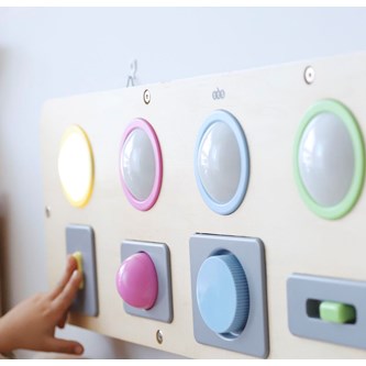 Kombinera kommunikation, stimulansrespons och orsakssamband med finmotorik och upptäckarlust. Varje del tänds med olika tekniker. Du kan trycka, växla, vrida, dra eller skjuta för att få cirkeln att lysa. Kan hängas på vägg eller användas på golv eller bord. Kräver 3 st AAA-batterier (ingår ej). Mått: 25x80x4 cm. Av plywood och ABS. PVC-fri. Från 10 månader.