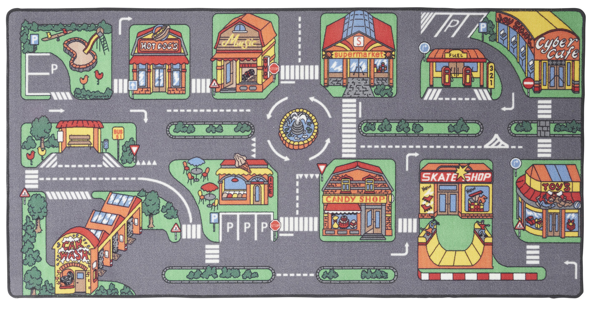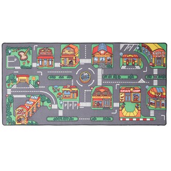 Trevlig lekmatta med motiv föreställande butiker, biltvätt etc. Halkskydd under. Av 100 % polyamid. PVC-fri. Rengöres via dammsugning, fläckar tas bort med milt rengöringsmedel och en blöt trasa.