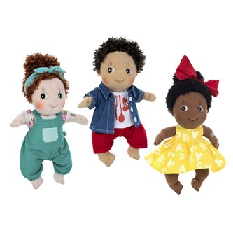 Mycket fina och mjuka dockor med egen personlighet och avtagbara kläder. Blandade färger. Dockor av polyester, stoppning av återvunnen polyester. PVC-fri. Från 0 år.