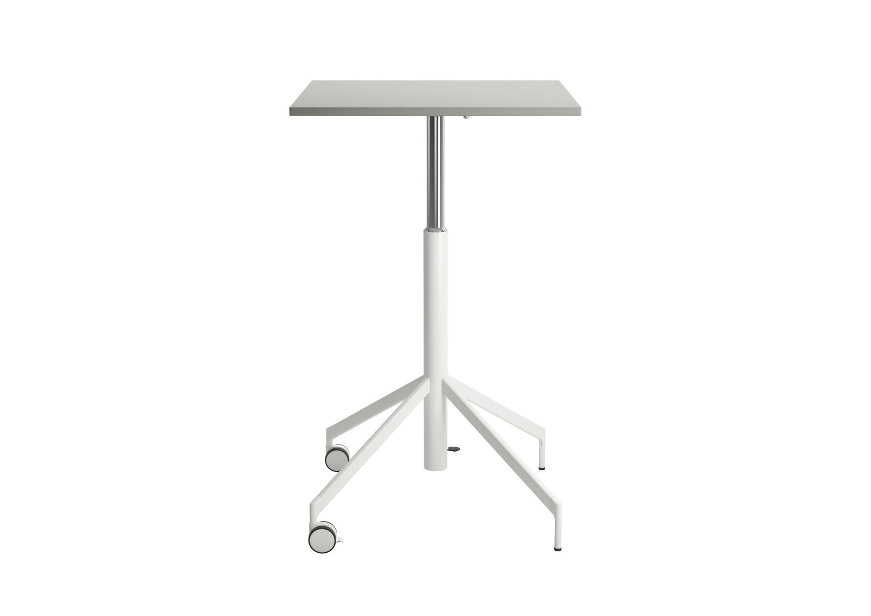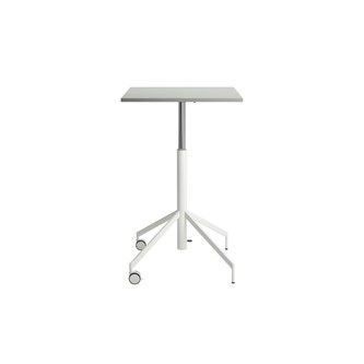 Ett höj- och sänkbart bord med fällbar skiva. Fäll skivan och rulla undan när plats behövs till annat. Höjd justeras smidigt med gasfjäder 73–118 cm. Vitlackerat stålrör i RAL 9016. 2 låsbara hjul. Skivan har måttet 65x65 cm och är i högtryckslaminat.
