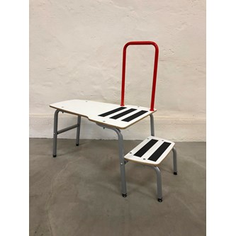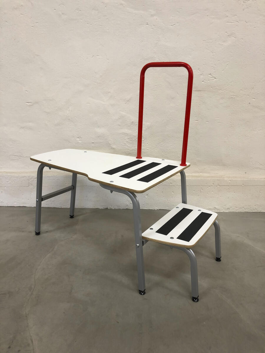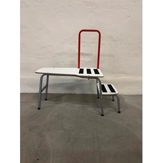 Påklädningsbänk som spar ryggen. Nedersta skivan används som trappsteg för barnet. Handtag att hålla sig i. Skiva med slitstarkt ljuddämpande linoleum. Stativfärg: silver. Sitthöjd: 43 cm. Mått: 110x52 cm.