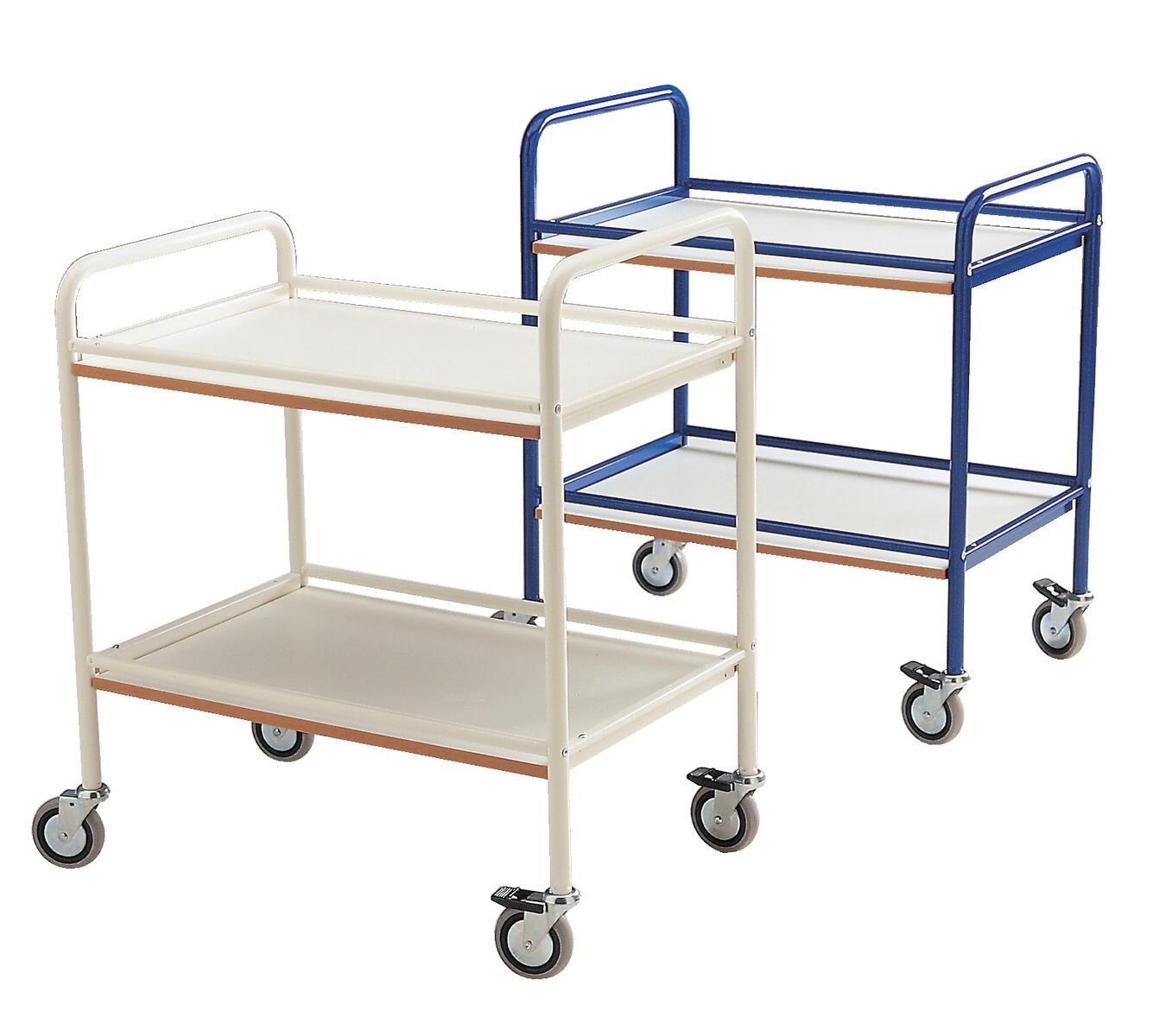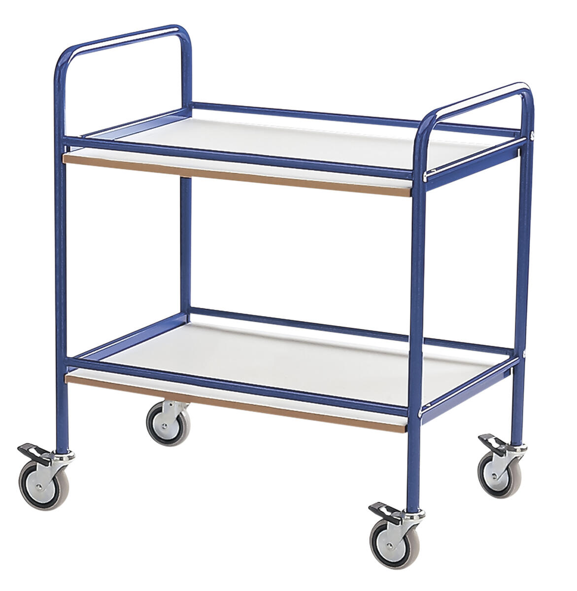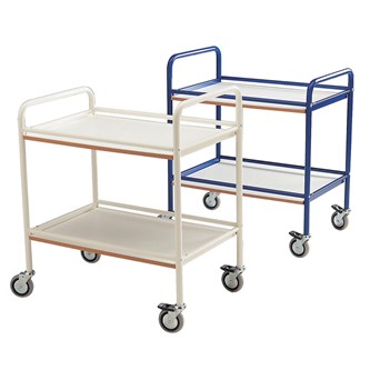 Förvarings- och serveringsvagn med 2 hyllplan. 4 st länkhjul varav 2 st låsbara, diameter 12,5 cm. Mått hyllplan: L90xB44 cm. Mått hel vagn: L108xB48xH94 cm, vikt: 23 kg. Maxbelastning 250 kg. Pulverlackad eller förzinkad plåt.