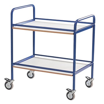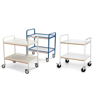 Stadig, tålig och lätt att hålla ren. Mått vagn: B76xD52xH83 cm. Avståndet mellan hyllplanen är 37 cm. Vikt 20 kg. Max belastning 100 kg. 2 låsbara hjul. Stomme av blålackerade stålrör och skivor i vitt laminat.