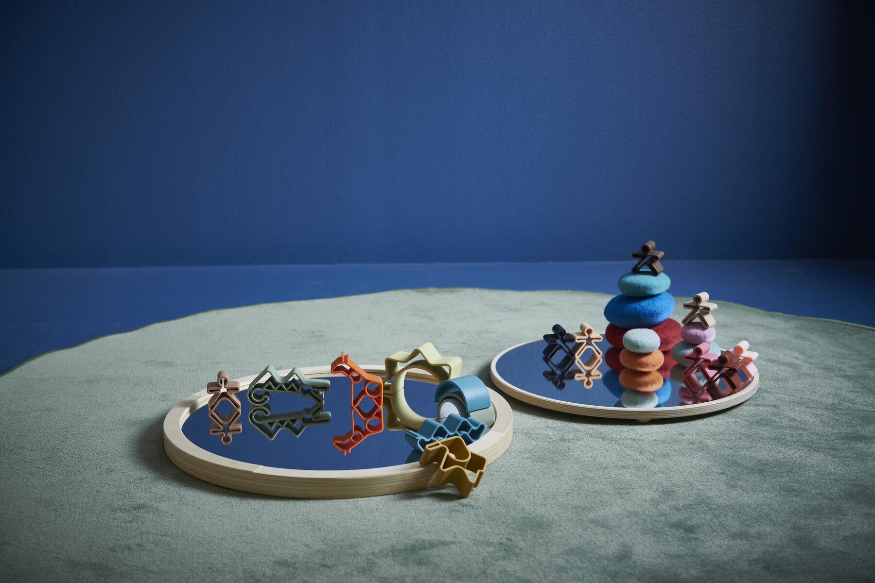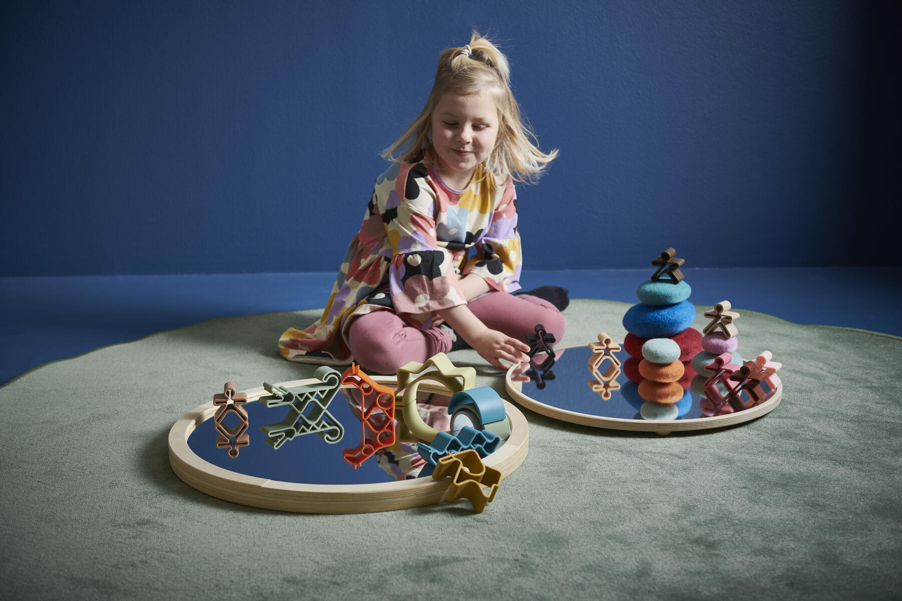 Spegel som bas för byggmaterial, t.ex. byggklossar. En spegel ger nya perspektiv vid byggande. För användning inomhus och med fördel mjuka produkter, då vassa föremål kan repa ytan. Torka av med mjuk trasa. Tillverkad av FSC-märkt plywood. Spegel av akryl. Mått: ø 58 cm, 3,5 cm hög. PVC-fri. Från 1 år.