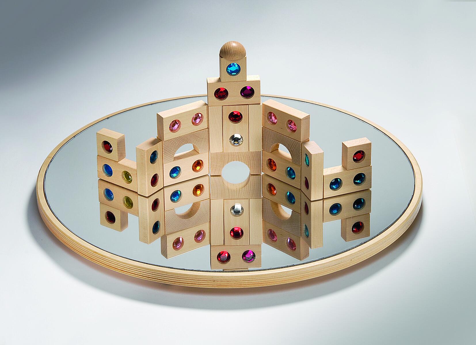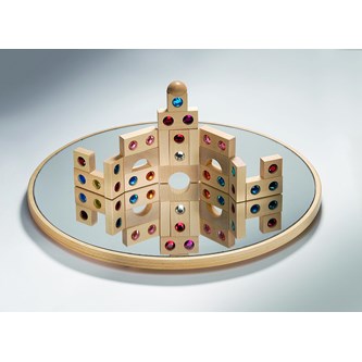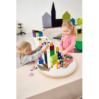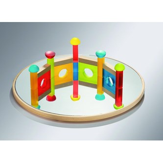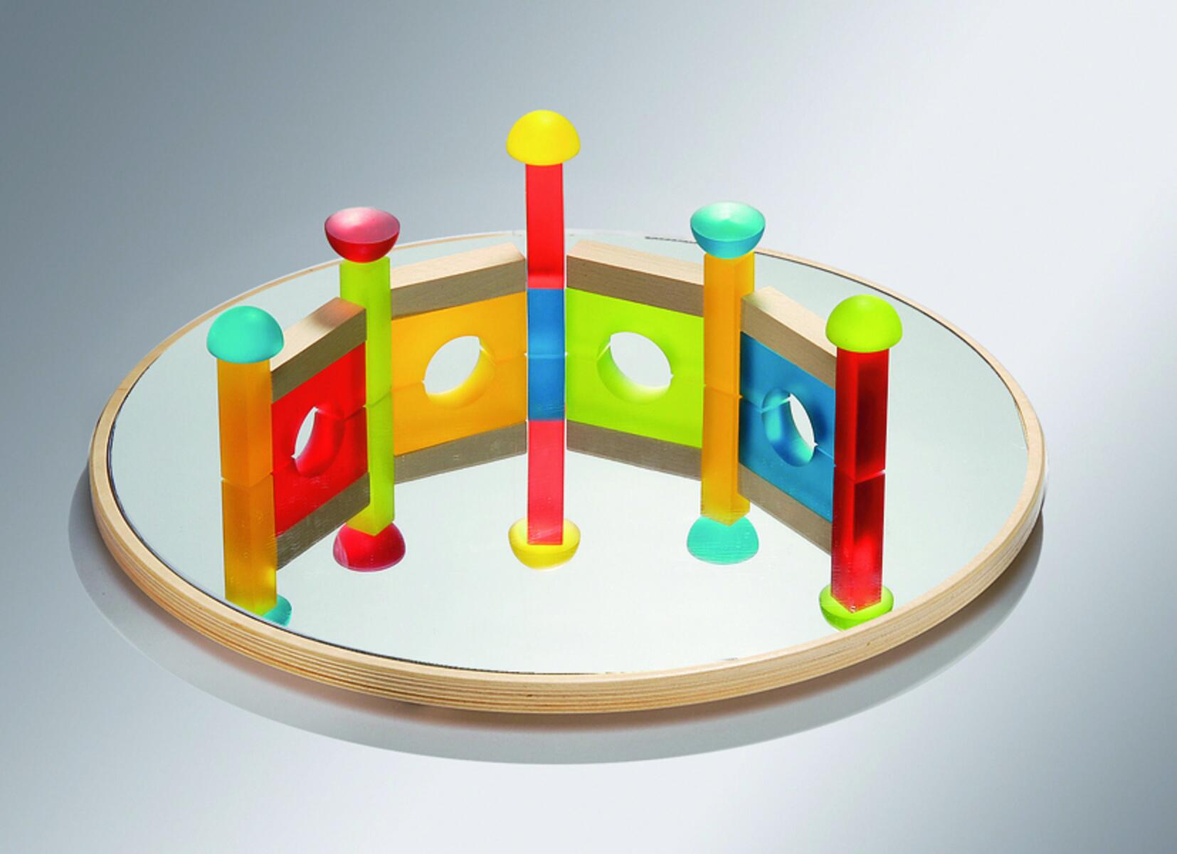 Perfekt lämpad som bas för konstruktionsmaterial som t.ex. byggklossarna Lyxo och Skatter. Genom att använda en spegel vid byggandet får man nya perspektiv. Strukturerna kan då även betraktas inifrån. Av plywood, 1,6 cm tjock, spegeln är försedd med säkerhetsfilm på baksidan. Mått: ø 50 cm, 3,5 cm hög. Från 3 år.