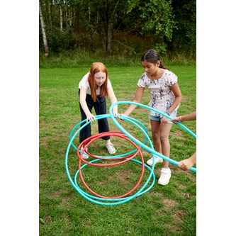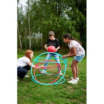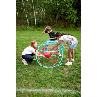 - Deltagarna i laget skall sedan försöka få igenom bollen från ena sidan till den andra utan att ringarna faller.