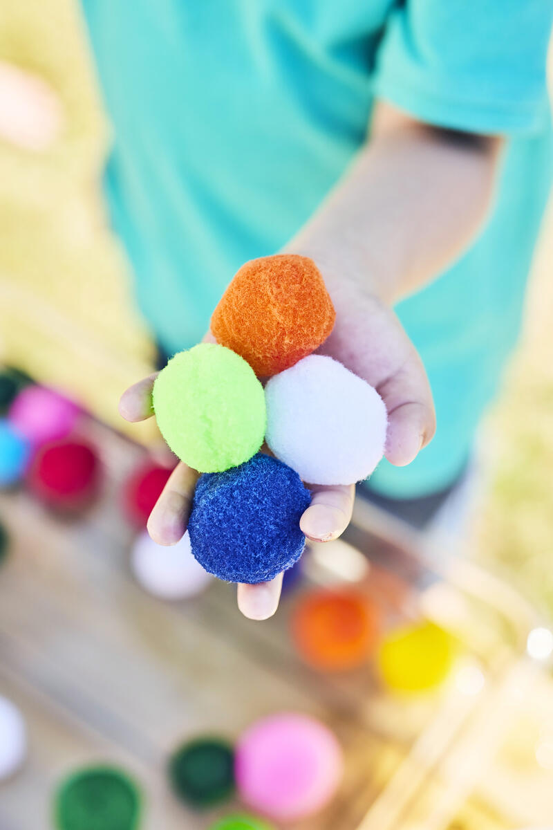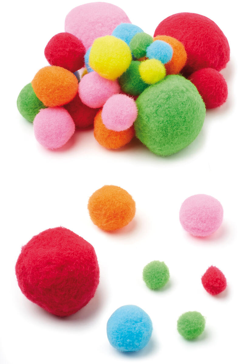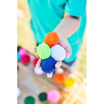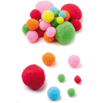 6 askar/fp. 250 st/ask. Varje ask har pompoms ton-i-ton i klara färger. Innehåller toner av gult, rött, lila, blått, grönt och grått. ø 20 mm. Från 3 år.