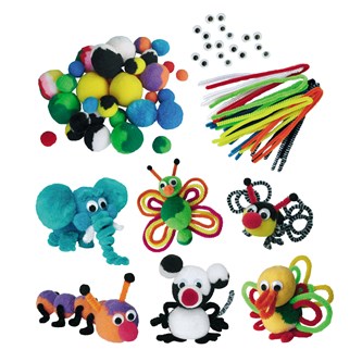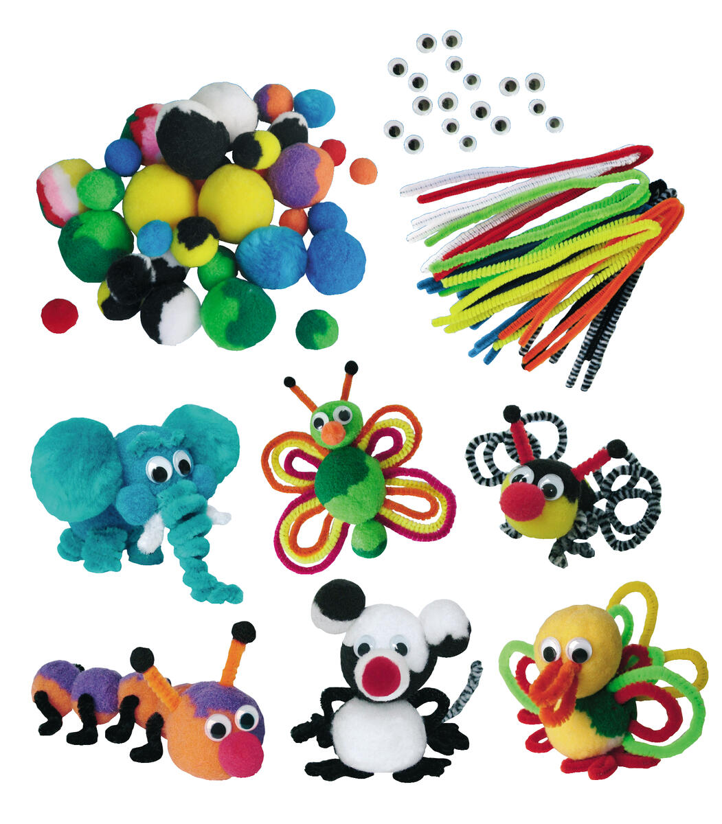308 st/fp. Mixsats med 132 pom-pombollar, 128 piprensare och 48 ögon. Förpackningen räcker till att göra 4x6 olika djur. Handledning till 6 djur ingår.