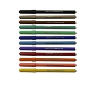 144 st/fp. Smala fiberpennor av god kvalitet. Med tålig spets som inte går att trycka in i pennan, och ventilerad huv. Vattenbaserat bläck som går lätt att tvätta av från textilier i maskintvätt 40 °C. Färger: gul, orange, röd, ljusblå, blå, lila, ljusgrön, grön, brun, rosa, grå och svart. 12 styck av varje färg. Längd 142 mm. ø 8 mm. Tjocklek spets 2,8 mm. Linjebredd 0,6 mm. Från 3 år. PVC-fri.
