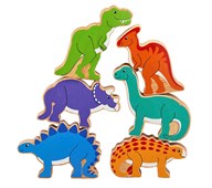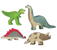 Mycket fina och rejäla dinosaurier av trä. Djurens design och stabila form gör dem lätta att leka med. De är ca 2,5 cm tjocka, mjuka och behagliga att ta i. Figurerna är målade med giftfri, vattenbaserad färg. Innehåller T-rex, Stegosaurus, Brontosaurus och Triceratops. PVC-fri. Från 3 år.