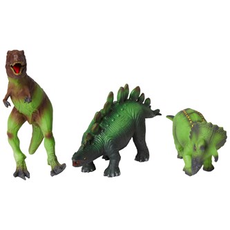 3 st/fp. Mjuka dinosaurier som passar bra för de yngre barnen. Innehåller stegosaurus, triceratops och tyrannosaurus (T-Rex). Höjd på T-Rex ca 22 cm. Ca längd på stegosaurus 29 cm. Av naturgummi. PVC-fri. Från 1 år.
