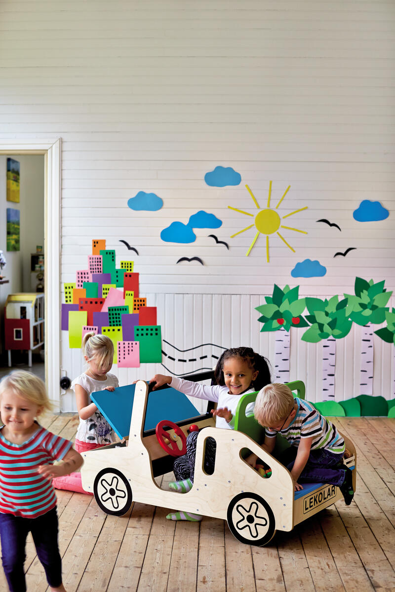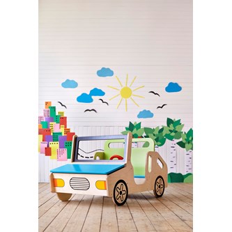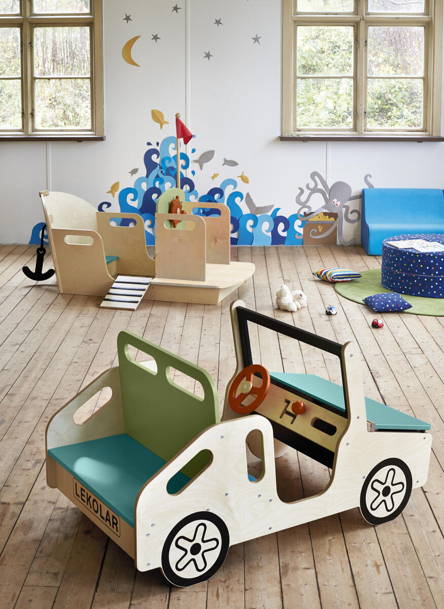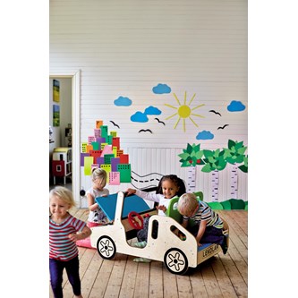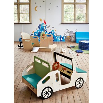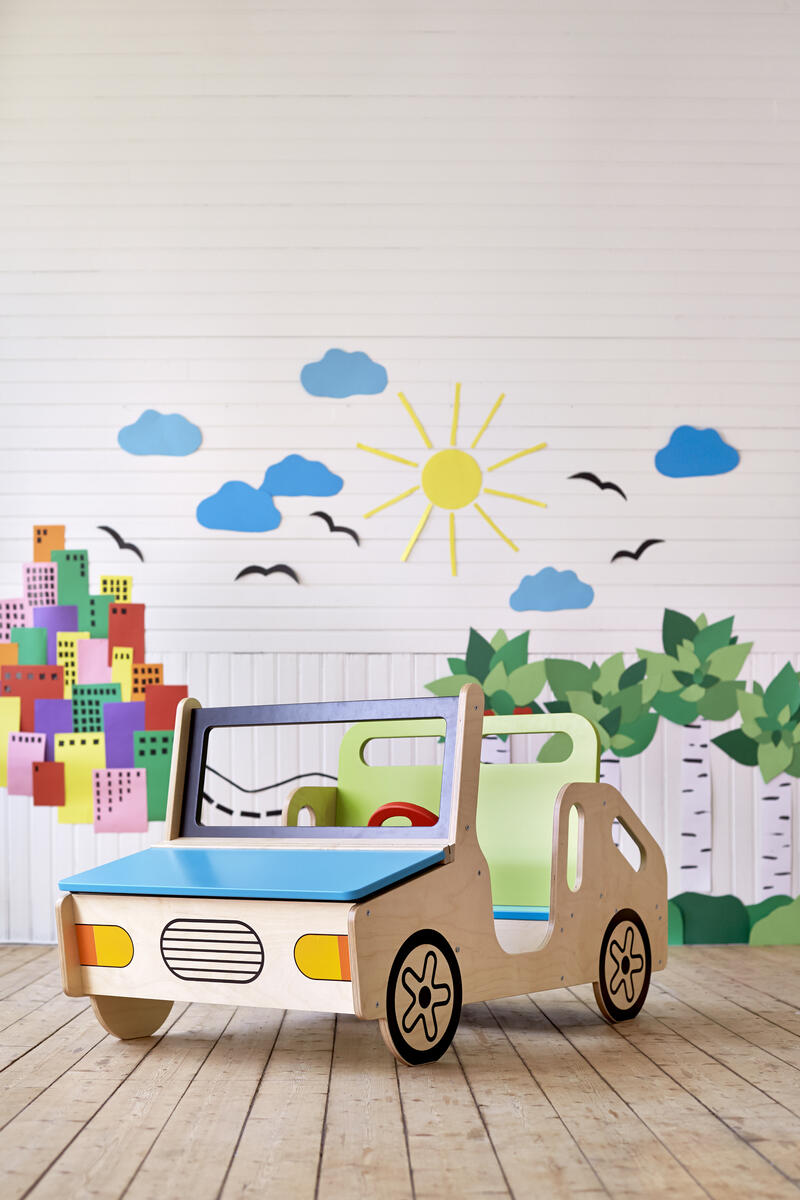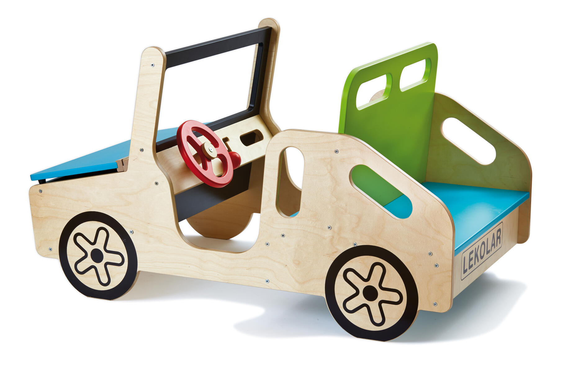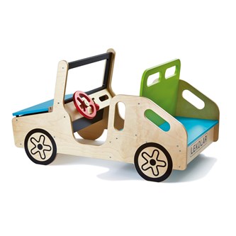 En tuff och rolig lekbil med plats för 4 barn. Man kan klättra in i bilen, köra, använda de rörliga instrumenten och ha passagerare där bak. Rörliga detaljer som ratt och växelspak. Öppningsbar lucka fram så att man i rolleken kan packa i och ur. Luckan stängs långsamt med hjälp av gasfjäder. Öppen botten förenklar städning. Lätt att flytta. Av kraftig, lackerad, FSC-godkänd plywood. Levereras omonterad, monteringsanvisningar finns att skriva ut under fliken dokument.