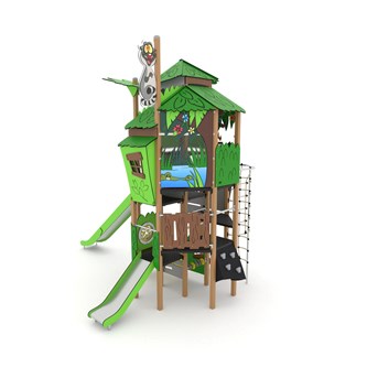 Ett högt aktivitetstorn med två rutschar. I övrigt finns det klätternät, klättervägg, klätterrep, koordinationspaneler och brandmannastång. Se produktblad för materialspecifikation och övrig info. Vid installation ska alltid den medföljande manualen användas. Den senaste versionen finns att tillgå på begäran.