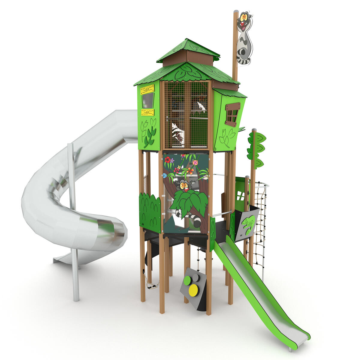 Ett högt aktivitetstorn med två rutschar. I övrigt finns det klätternät, klättervägg, klätterrep, koordinationspaneler och brandmannastång. Se produktblad för materialspecifikation och övrig info. Vid installation ska alltid den medföljande manualen användas. Den senaste versionen finns att tillgå på begäran.