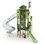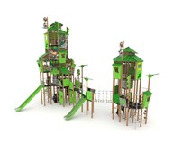 Två höga aktivitetstorn med fem rutschar. I övrigt finns det klätternät, klättervägg, klätterrep, koordinationspaneler, stegar, broar, brandmannastång och en liten gungrem. Se produktblad för materialspecifikation och övrig info. Vid installation ska alltid den medföljande manualen användas. Den senaste versionen finns att tillgå på begäran.