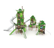 Sex höga aktivitetstorn med sju rutschar. I övrigt finns det klätternät, klättervägg, klätterrep, koordinationspaneler, stegar, broar, brandmannastång och en liten gungrem. Se produktblad för materialspecifikation och övrig info. Vid installation ska alltid den medföljande manualen användas. Den senaste versionen finns att tillgå på begäran.