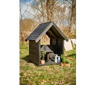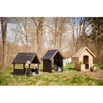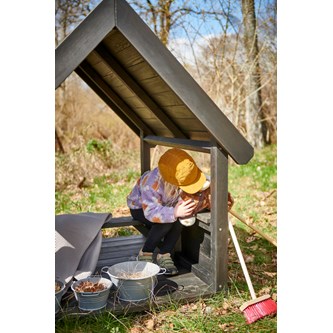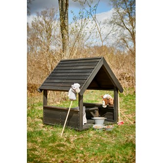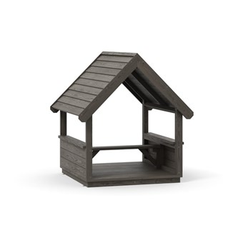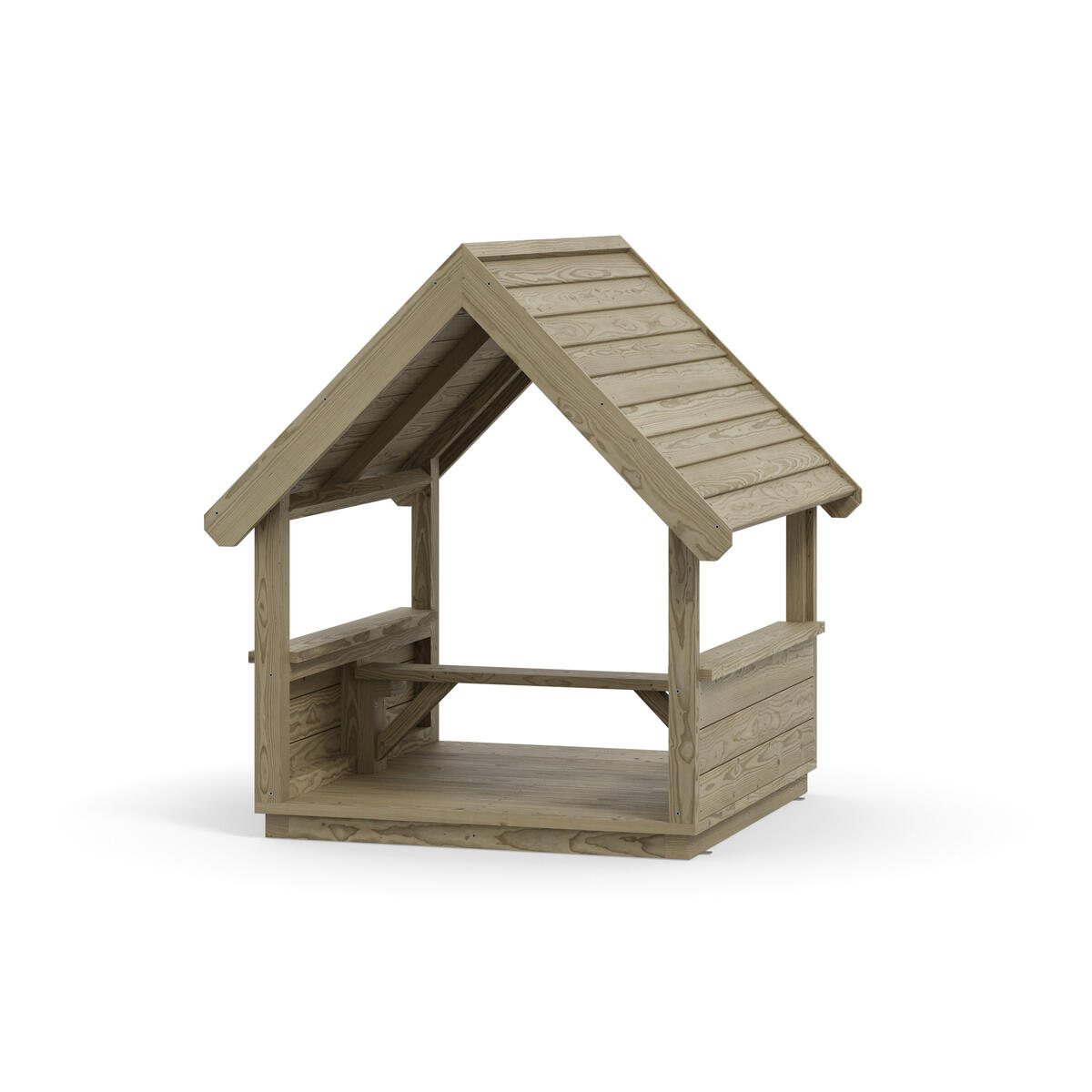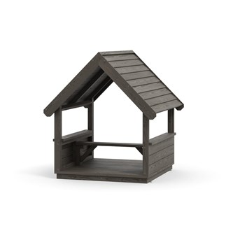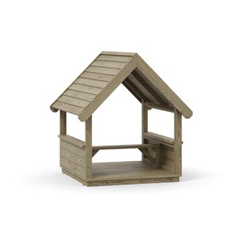 Ett mysigt och lättplacerat litet lekhus som lockar till lek. Lekhuset är inrett med ett litet bord på ena sidan, en halv avskiljningsvägg i mitten och en bänk på motsvarande sida. Avskiljningsväggen skapar möjlighet för barn som inte vill delta i rolleken att ändå känna en delaktighet och kan leka bredvid. Kortsidorna är helt öppna vilket ger pedagogerna en bra överblick, men även en möjlighet till avskärmning för barnen. Av massiv,PEFC-märkt furu. Mått: 128x145x171 cm. Levereras omonterat. Lösning för nedgrävd markförankring eller ytmontering väljs under tillval.