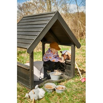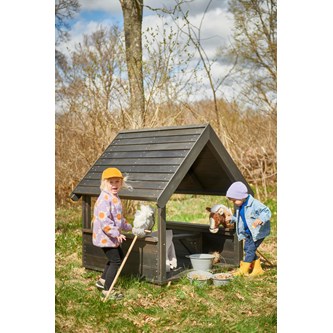 Ett stort lekhus som uppmuntrar till fantasifull rollek och att imitera vardagslivet i hemmet. Det lilla fönstret på bakre gaveln och det stora på kortsidan gör att lekhuset fungerar lika bra som kiosk eller affär. Ibland blir det för mycket intryck i utemiljön och då kan det vara skönt att kunna dra sig undan och använda huset som en reträttplats. Huset är inrett med ett bord och 2 bänkar och har en fin liten altan. Av massiv, PEFC-märkt furu. Mått: 190x160x196 cm. Levereras omonterat. Lösning för nedgrävd markförankring eller ytmontering väljs under tillval.