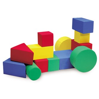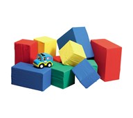 Kallskum. Klädd med avtagbart bomullstyg i blandade färger. 14 st byggklossar: 2 st 40x40x20 cm, 4 st 40x20x20 cm, 2 st 20x20x20 cm, 2 st cirkel diam. 40x20 cm, 2 st cylinder diam. 20x40 cm, 2 st triangel 40x40x56/20 cm. Oeko-Tex.