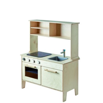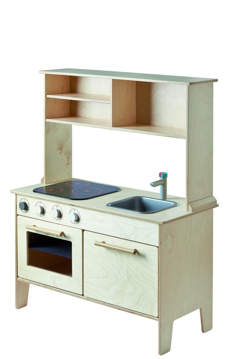 Ett lekkök i plywood som lever upp till förskolans höga krav. Med många olika funktioner som spishäll med 3 plattor, ugn, rörliga vred med tydliga graderingar, öppningsbara luckor och utdragbar plåt, diskho samt bra hyllförvaring i överskåp. Stora ljusa träytor som passar in i många olika miljöer. Höga ben förenklar städning. Av kraftig, lackerad, FSC-godkänd plywood. Diskbalja av PP. Levereras i 2 delar som enkelt skruvas ihop. Ska förankras i vägg. Från 2 år.