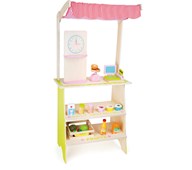 Kombinerat marknadsstånd och teater för stimulerande rollek. Barnen tränar på att turas om, att handla och att sälja, vilket ger en bra grund för matematiken. En sida med hyllor och en sida med magnetisk blackboard. Mått: 125x66x29cm. Höjd till disken: 59 cm. Av FSC-märkt trä. PVC-fri. Från 3 år.