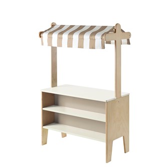 Ett stabilt och funktionellt marknadsstånd för stimulerande rollek. Barnen tränar på att turas om, att handla och att sälja, vilket ger en bra grund för matematiken. Framsida med hyllor för skyltning. Av kraftig, lackerad FSC-märkt plywood med markis av Oeko-Tex-godkänt tyg. Enkel montering av 2 delar. Tillbehör ingår ej. Höjd mellan golv och bänk: 53 cm.