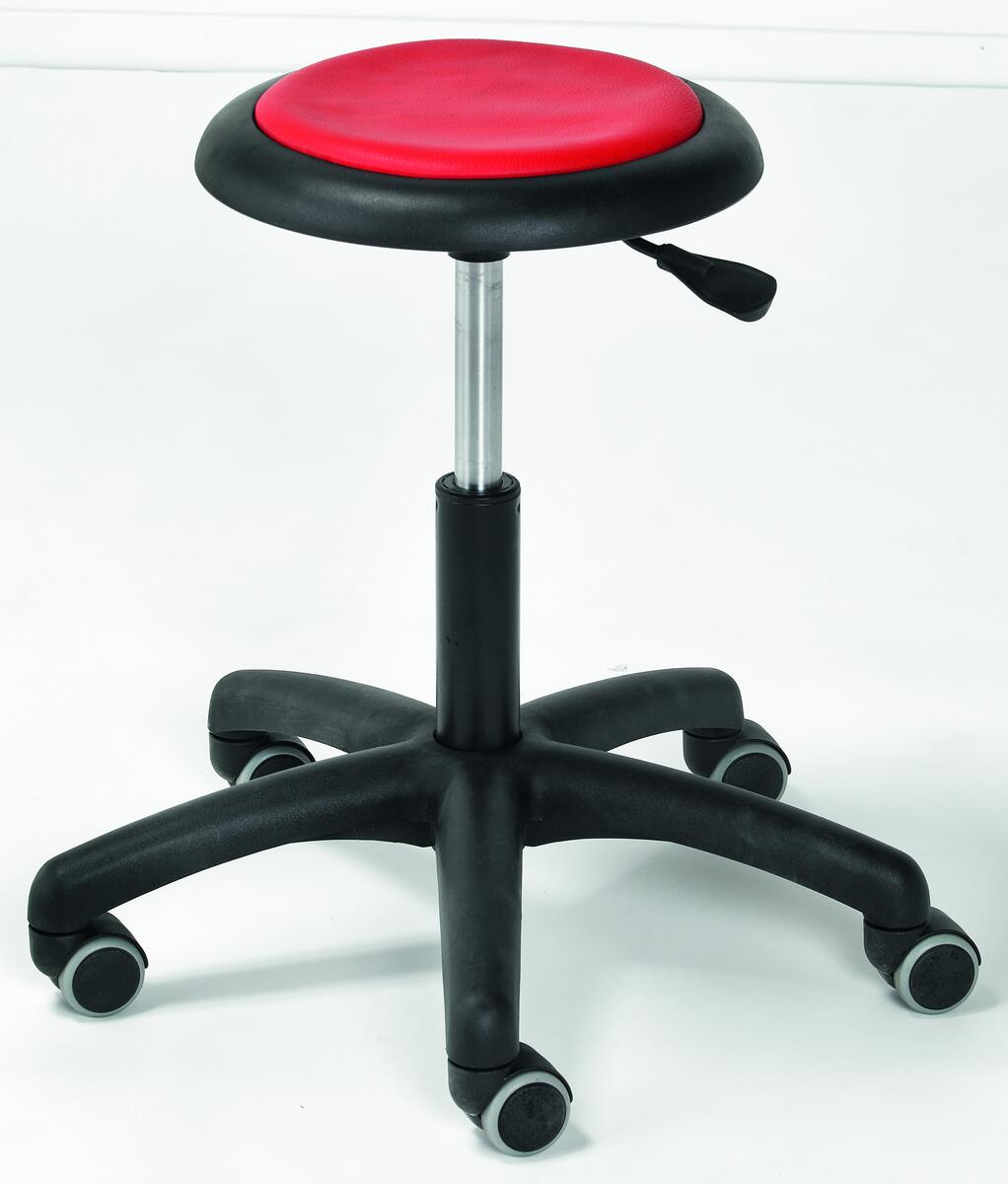 Bekväm och ergonomisk sadelstol, inklusive ryggstöd. Ställbar sitthöjd 35–44 cm. Totaldiameter på sits 32 cm. Totaldiameter på fotkryss 55 cm. Sits i konstläder med stoppning.
