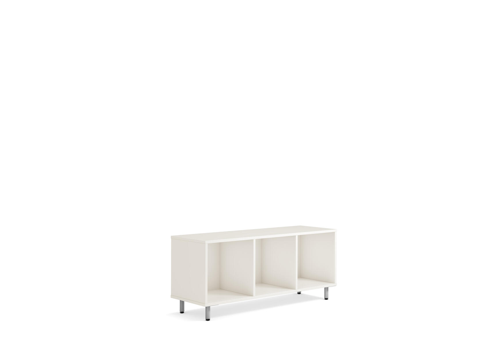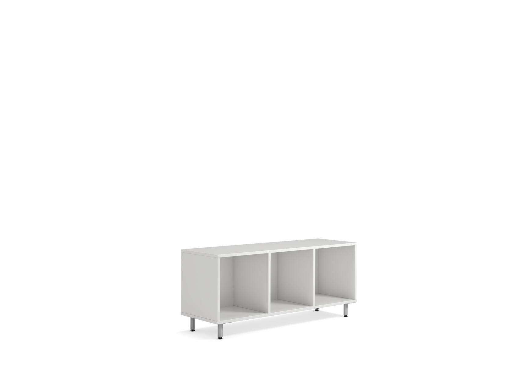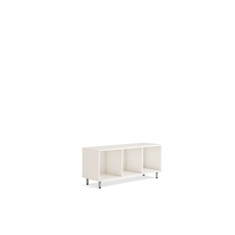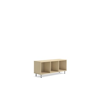 Beställ alltid via säljare för att säkerställa ritning. Elevförvaring som byggs efter eget önskemål och levereras färdigmonterad. Stommar har förborrade hål i sidopaneler/skiljeväggar för att kunna erbjuda alla tänkbara kombinationer. Denna stomme med ben har tre öppna hyllor. Lägg till dörrar eller lådor enligt önskemål och levereras färdigmonterad. Elevförvaringen kan också användas helt öppen. Lådor och dörrar har en smal öppning som agerar postfack och öppnare. Material 18 mm spånskiva med laminat. Kantband i ABS. Stomme med ben och sockel ska fästas i vägg med medföljande väggbeslag. Skruv för detta ingår inte. Ben, sockel och hjul bygger 10 cm i höjd. Innermått fack: B38xD38xH38 cm.