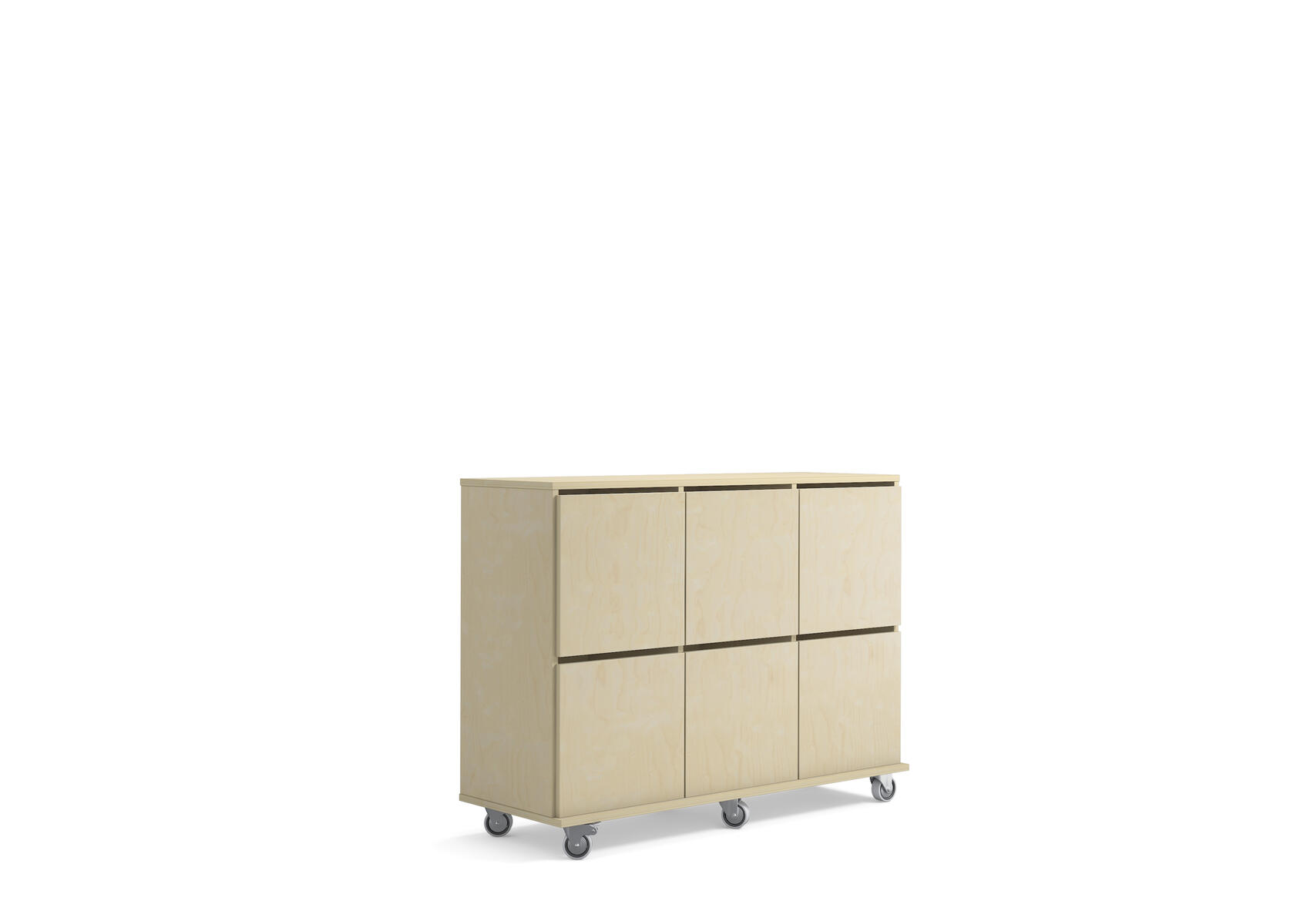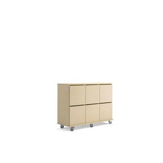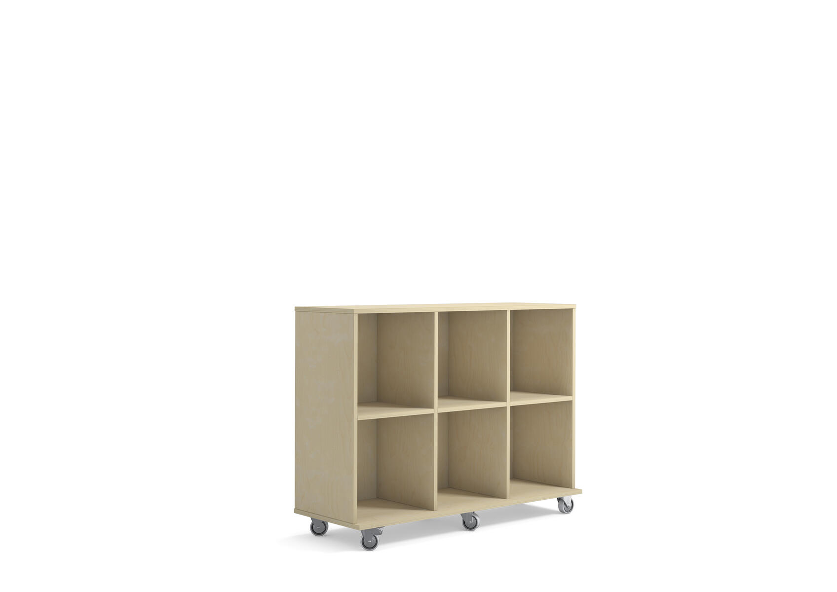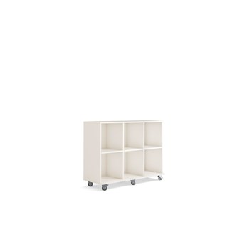 Beställ alltid via säljare för att säkerställa ritning. Elevförvaring som byggs efter eget önskemål och levereras färdigmonterad. Stommar har förborrade hål i sidopaneler/skiljeväggar för att kunna erbjuda alla tänkbara kombinationer. Denna stomme har sex öppna hyllor, med bottenplatta som är något bredare för ökad stabilitet. 6 hjul varav två är rörliga och med lås på ena kortsidan. De två i mitten är också rörliga. Den andra kortsidan har två är fasta, vilket gör förvaringen stabil vid förflyttning. Lägg till dörrar eller lådor enligt önskemål och levereras färdigmonterad. Elevförvaringen kan också användas helt öppen. Lådor och dörrar har en smal öppning som agerar postfack och öppnare. Material 18 mm spånskiva med laminat. Kantband i ABS. Hjul bygger 10 cm i höjd. Innermått fack: B38xD38xH38 cm. Bottenplatta D44,5 cm.