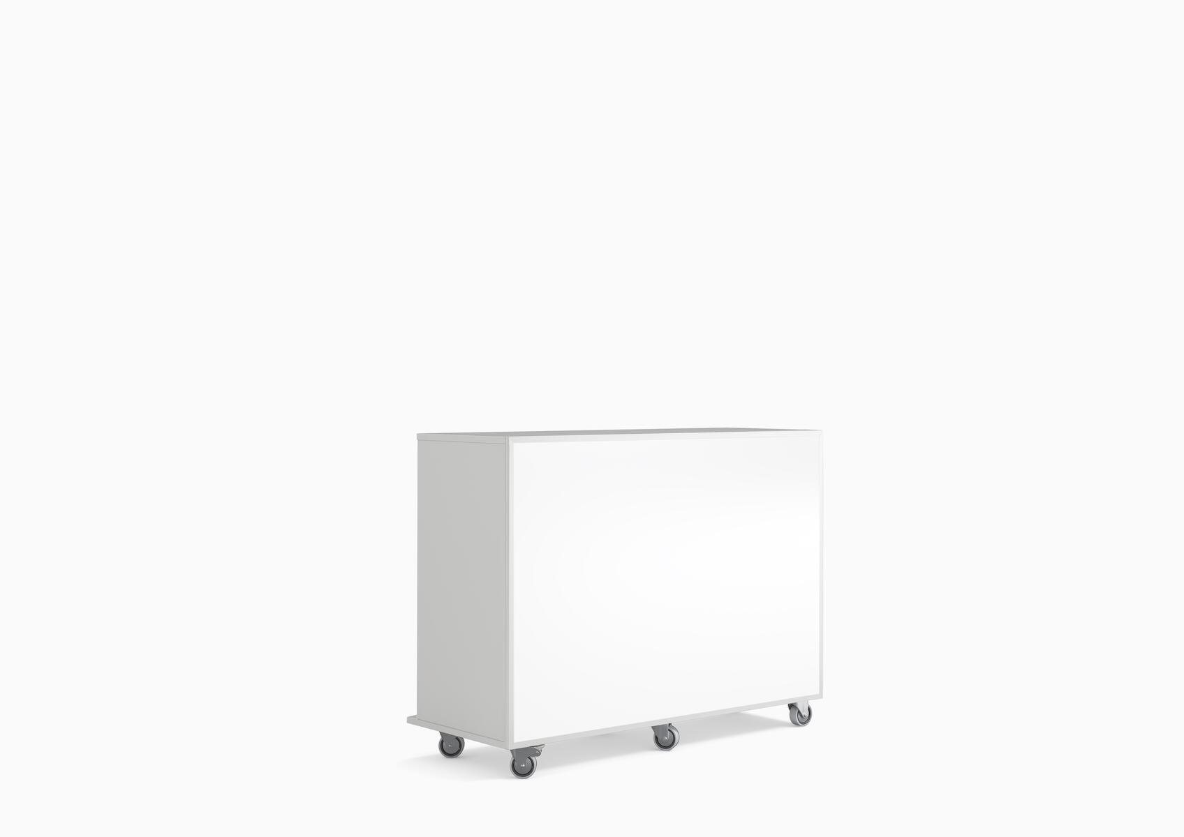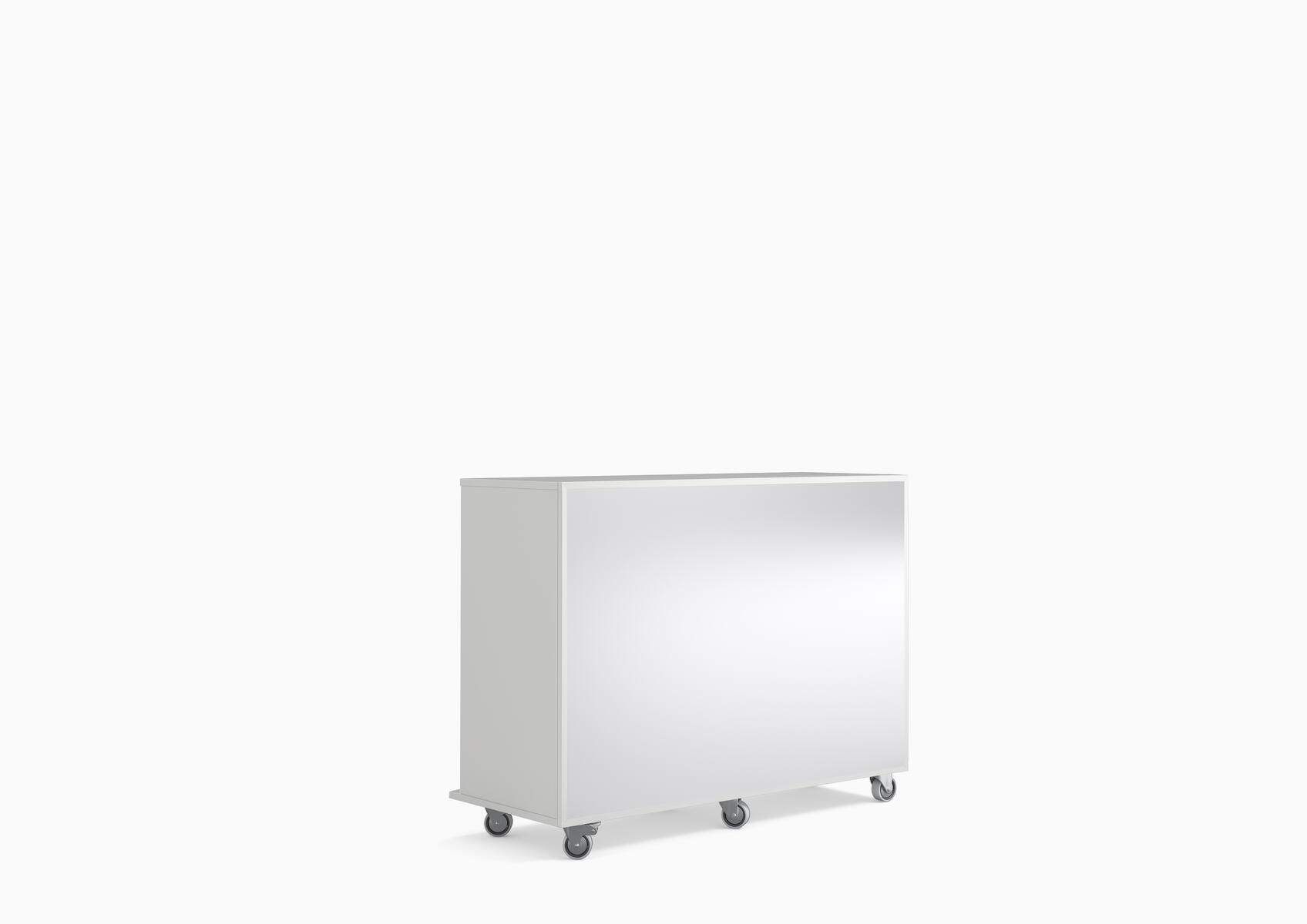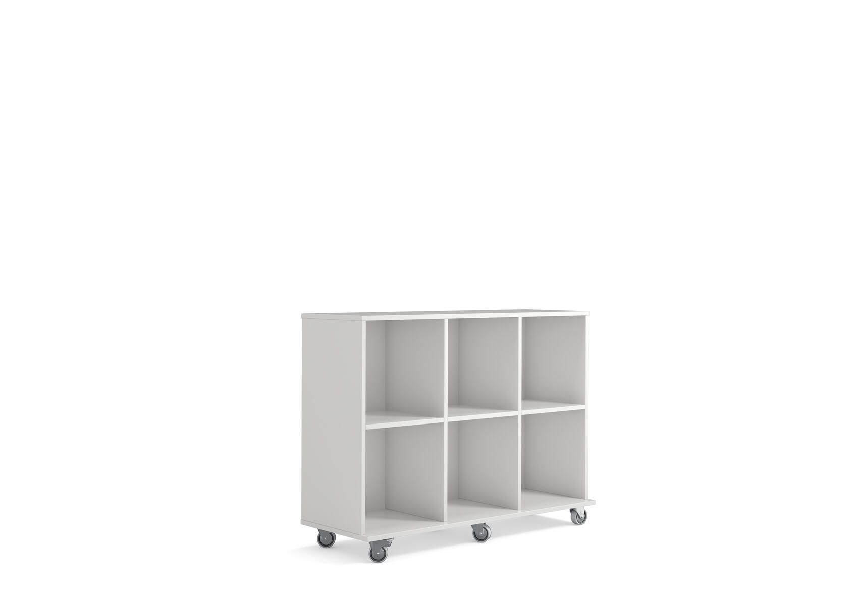 Förvaringshylla med öppna hyllor och hjul. Bottenplattan är något bredare för ökad stabilitet. 4 hjul varav två är rörliga och med lås på ena kortsidan. De andra två är fasta, vilket gör förvaringen stabil vid förflyttning. Material 18 mm spånskiva med laminat med kantband i ABS. Stomme med ben och sockel ska fästas i vägg med medföljande väggbeslag. Skruv för detta ingår inte. Ben, sockel och hjul bygger 10 cm i höjd. Innermått fack: B38xD38xH38 cm. Utan förborrade hål. Önskas lådor eller dörrar, välj Svea elevförvaring. Bottenplatta D44,5 cm.